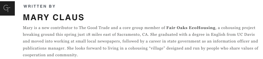 If you are interested in finding a community to join, or launching a new one you can visit www.cohousing.org for a wealth of resources, including a map of both established communities and in-process groups. For a comprehensive overview, refer to books by the parents of U.S. cohousing, Katie McCamant and Chuck Durrett: Creating Cohousing: Building Sustainable Communities and The Senior Cohousing Handbook. If you are a California resident, Fair Oaks EcoHousing is welcoming new members and will be the next to break ground in the Golden State.