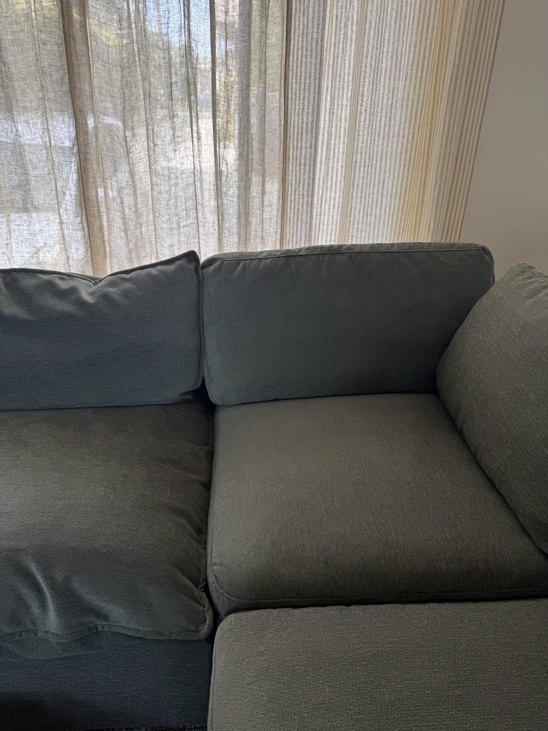 Albany Park offers several fabric options, including performance linen, velvet, chenille, boucle, and brushed canvas, and the swatches helped us make our decision. We ultimately chose the chenille, which checked all the boxes: it’s machine washable, kid- and pet-friendly (important with our dog), and OEKO-TEX certified, meaning it has been tested for harmful substances and deemed safe for home use. It’s also stain- and liquid-resistant, and even better, it’s made using a water-free manufacturing process that saves around 300 liters of water per sofa. That kind of sustainability, especially from a performance fabric, made it a no-brainer.