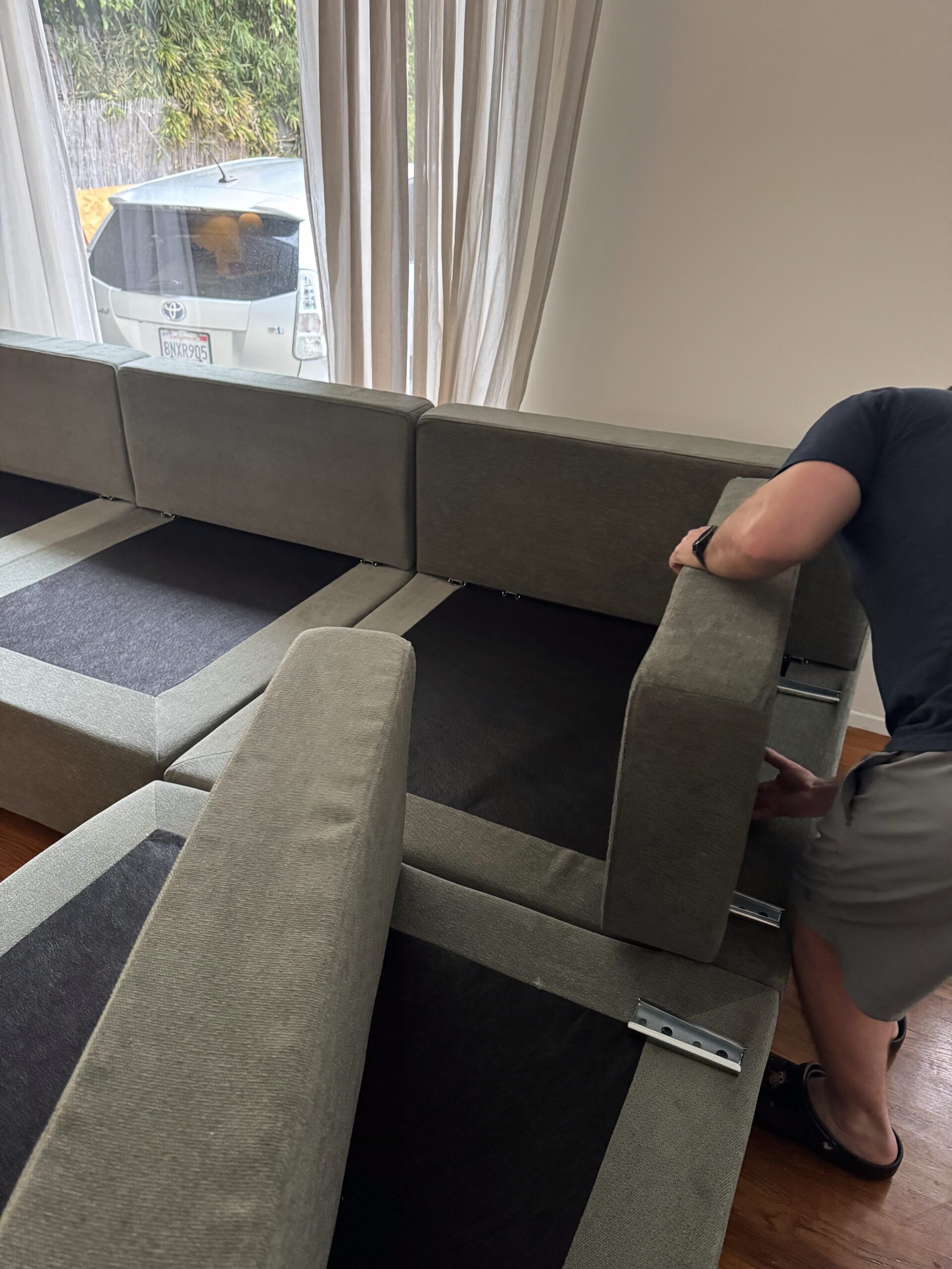 The setup? Shockingly simple. Albany Park designs its sofas to be assembly-friendly, and the Kova is no exception. The hardest part was just unboxing everything — once that was done, it took us maybe twenty minutes from start to finish. Each modular piece clicks together with metal claw-style connectors, requiring no tools for assembly. The seat cushions feature anti-slip backing to keep them in place. The back cushions fluffed up beautifully after being unsealed, and within half an hour, we were lounging like pros.