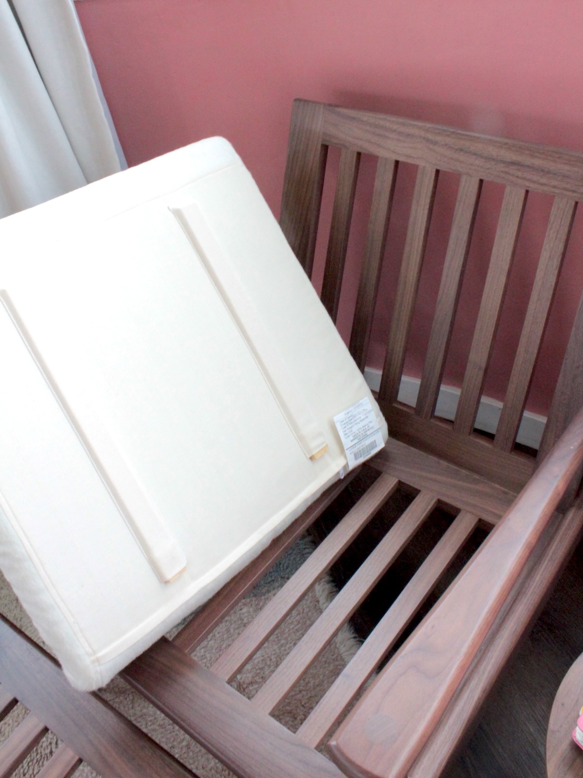 I especially love that the seat cushion has two wooden slats stitched into the underside, which keeps the cushion from sliding while I sit. And the upholstery — OH, the upholstery! The alpaca fiber is super soft, and durable against a kitty cat who currently needs her nails clipped.