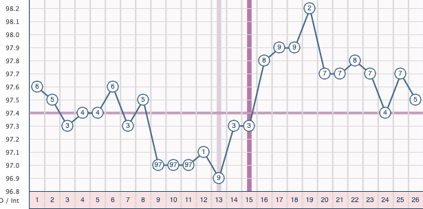 Here’s an example. The below chart, shared with permission from one of our editors, shows an average BBT of 97°F–97.4°F before ovulation (the follicular phase) and an average BBT of 97.5°F–97.9°F after ovulation has occurred (the luteal phase).