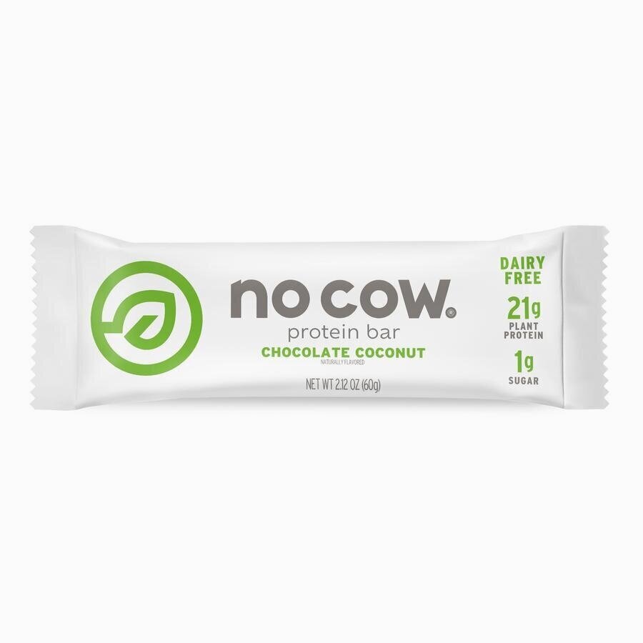 Got a sweet tooth like we do? No Cowâs Chocolate Coconut Protein Bar made with 100 percent raw cacao nibs will satisfy that craving. Even better, with a whopping 21 grams of protein, and an ingredient list that doesnât include soy, dairy, gluten, or added sugar, itâs the perfect plant-based snack.
