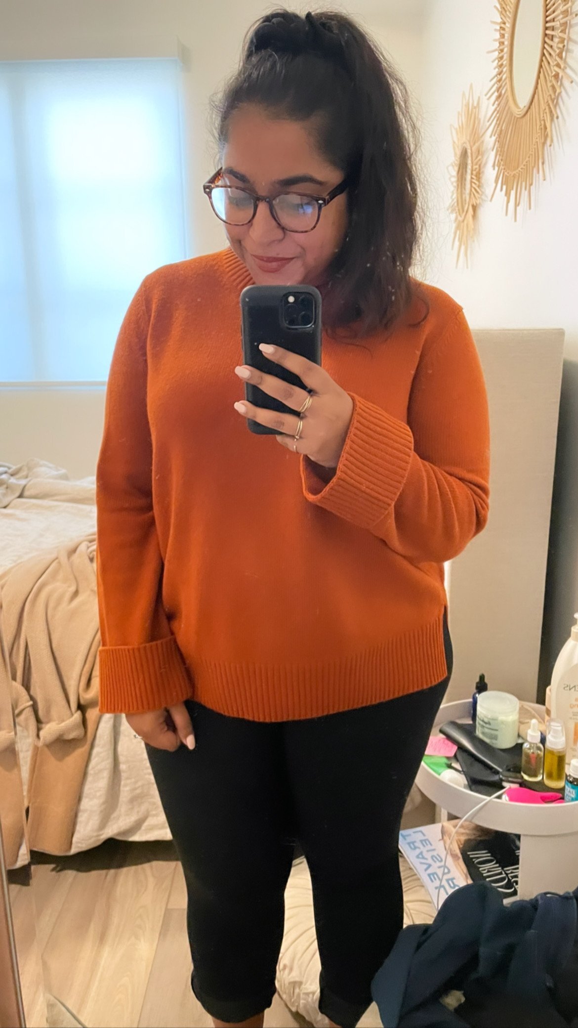 Next up was the Cathryn Cashmere Sweater in Fire Opal, a color most akin to tan or buckwheat. With a statement collar and deep V-neck, it reminded me of a cross between a nautical sailor and preppy collegiate—in a good way! I purposely ordered this one a size up for an oversized fit; it ended up being a bit too big (oops), but this sweater is also incredibly soft and comfortable. I have yet to layer this over a top, but I imagine it’d feel like wrapping myself up like a burrito. I give this a nine out of ten.