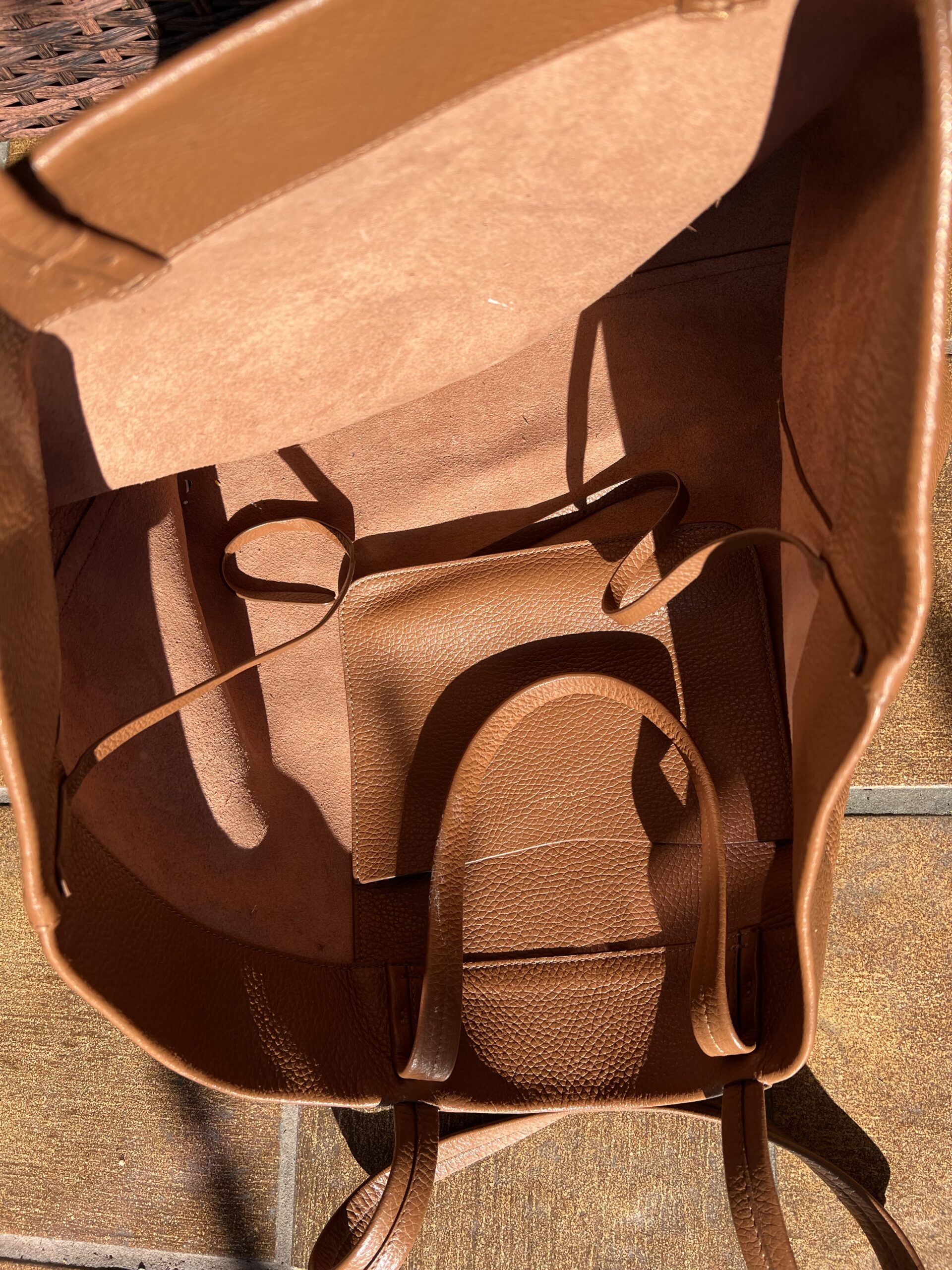 Functionality is where this bag really shines. The adjustable crossbody strap makes it easy to wear hands-free, but I often find myself reaching for the smaller, round top handles — they’re satisfyingly sturdy and make the bag feel even more versatile. (I’m not sure if that’s the “intended” way to carry it, but it works for me.) The squared-off bottom is a thoughtful detail; it helps the bag stand up on its own, which is a small luxury versus having a giant tote bag flopped out on a table. If I could change one thing, I’d add tiny metal feet to the bottom—since I don’t frequent places with bag hooks, my Paloma sometimes ends up on the floor (aggh I’m sorry, little bag!). The leather itself is thick and structured, a bit more rigid than my beloved Easy Tote, which gives the Mini Paloma a polished, architectural look that I adore. The zipper is sturdy and features a shiny gold finish, though I did have to give the lug a little squeeze with pliers to keep the pull from slipping off — a quick fix, but worth mentioning. I’m sure not all bags will need this!
