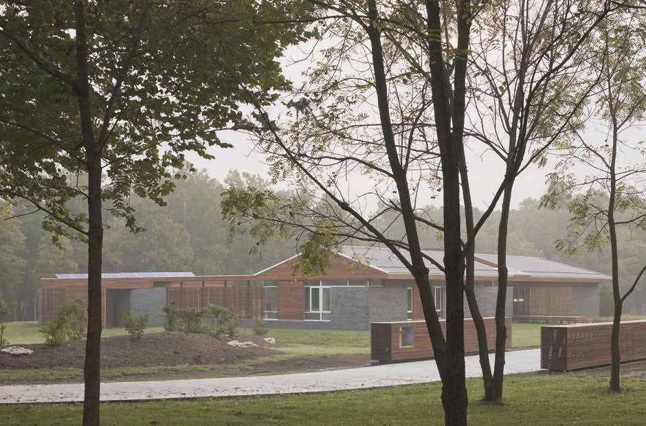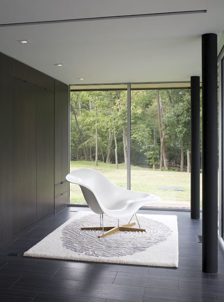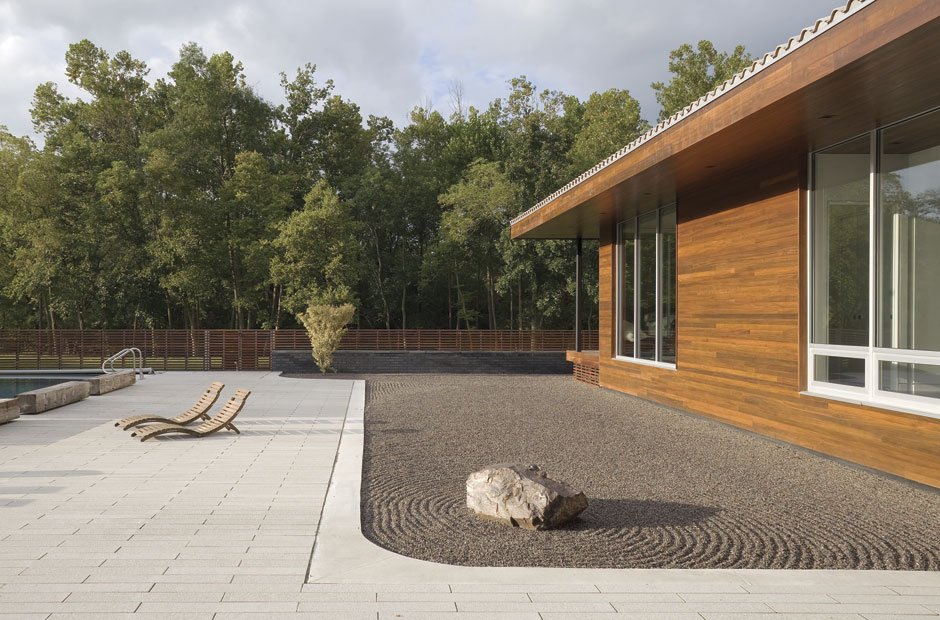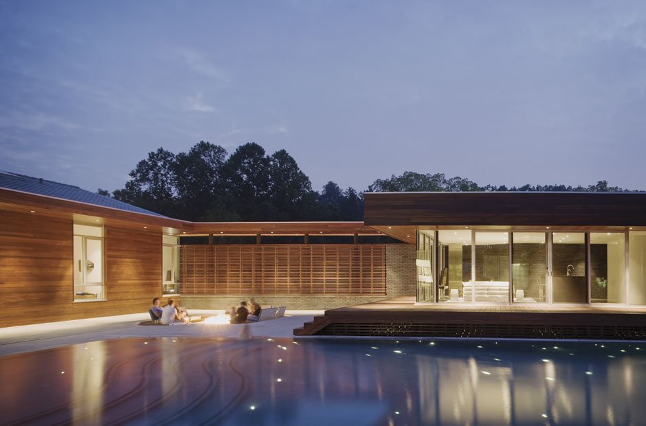 From the outside, The Curved House has an unassuming posture that evokes curiosity. Once inside though, the home shines with distinctive character and thoughtful placement of community spaces. The home was designed by Hufft Projects an architecture firm that has quietly built an impressive portfolio of modern designs in the heart of America. The Kansas City-based firm considered sustainability at every phase of designing The Curved House, most notably with a solar array on the cabana roof, a geothermal system and radiant floor heating.