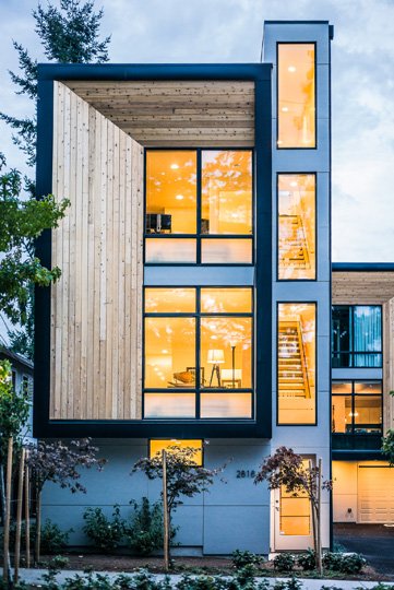 Method Homes is known for its sustainable prefab concepts. This series of modern three-story townhomes brings a kind of livable futurism to West Seattle. Prefab construction allows for a drastic reduction in material waste and gives Method the ability to efficiently integrate LEED, ENERGY STAR and Passive House standards into their projects.