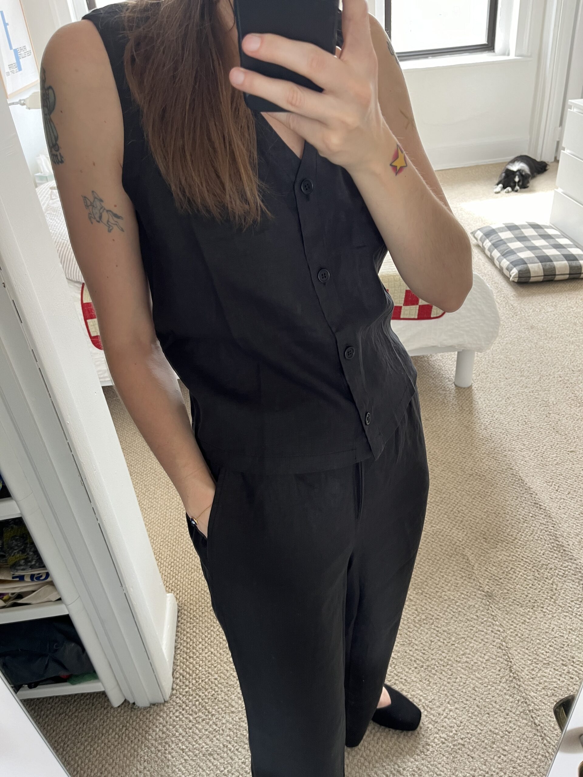 As a perpetual wearer of small tops and big bottoms, I’d been looking for the right sleeveless vest that would veer more Alison Roman than caterer stuck at a cocktail party. This vest was it. I’m so thrilled that it toes the line between professional and laid back, so I can incorporate it easily into my closet. (Does anyone else ambitiously buy “dressy” clothes and then let them sadly hang untouched in their closet? Or just me?)