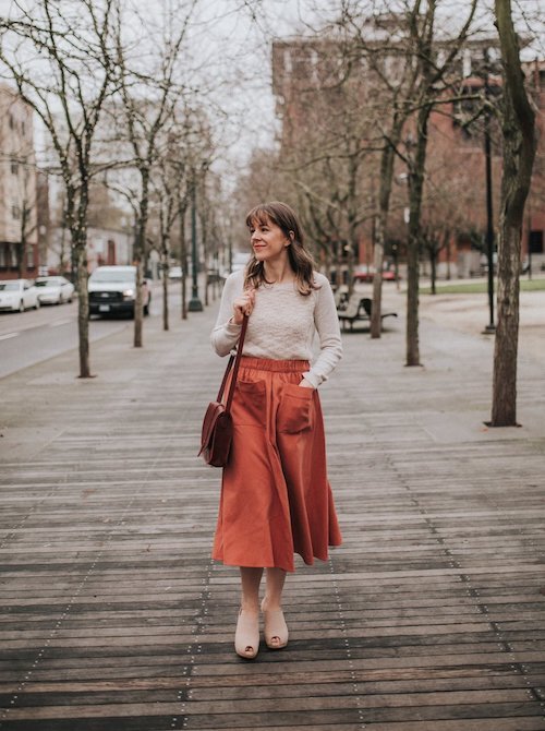 We love how Andrea from Seasons + Salt plays around in the same color family with rusts, reds and browns—making us think all things fall. A long skirt in a heavy fabric makes a perfect transitional piece and pairs well with both cozy knits and simple tees.