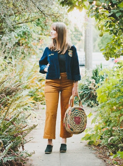 When fall hits, all of our mustard and rust-colored pieces hit center stage in our closets—they’re warm, festive, and complement our fading summer tans. Karin from Truncation is giving us cozy vibes in this classic denim and mustard yellow combo, topped off with natural accessories like clogs and a woven bag.
