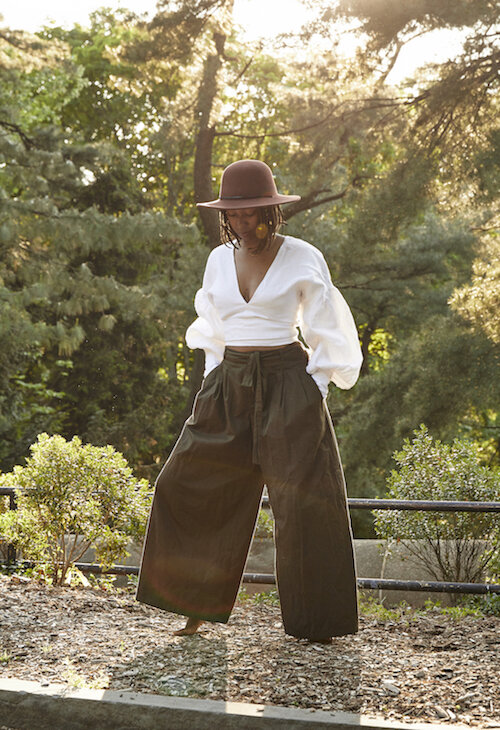 Turn up the drama on simple, natural-fiber pieces by mixing and matching garments with different silhouettes. Big sleeves, wide legs, or both! Dominique Drakeford, founder of Melanin & Sustainable Style plays with volume and texture while staying rooted with timeless wardrobe staples.