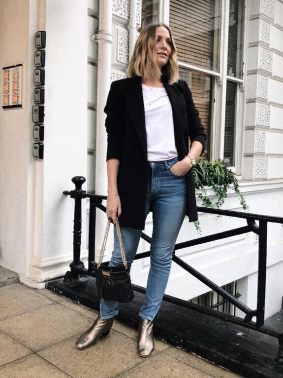 Not all holiday parties call for red dresses and strappy heels. Take notes from Signe, the blogger behind Use Less, who’s pulled together the best in casual party attire. A blazer and statement boots are perfect for a low-key outing, whether you’re going to a Friendsgiving or a holiday happy hour with your coworkers. Pair with your favorite white t-shirt and your go-to necklaces for a cute and casual party outfit.