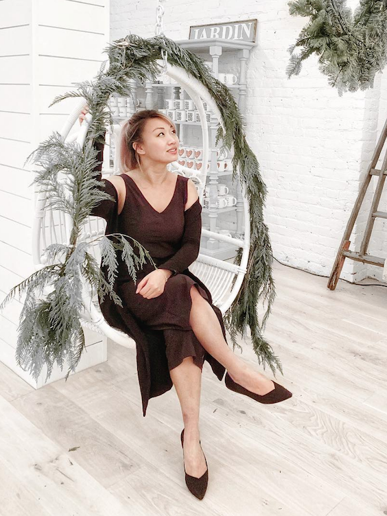 Whenever I think of holiday parties, I instantly think of a deep red dress and black shoes—it’s such a festive outfit that’s also super versatile in other seasons. Style blogger Lindsey Brown is wearing a rented dress here, which is also an excellent option for special occasions or black-tie holiday parties.
