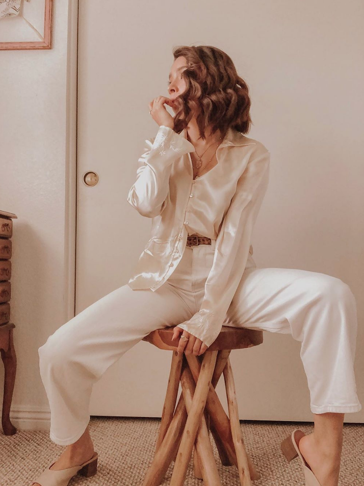 Who else misses the liberating feeling of a snow day? Recreate those cheerful vibes with an all-white outfit. Again, going monochrome means you can have some fun with texture, like Aja from Aja With Love does with this white satin blouse. Pair with light mules or a statement boot. Pop on a camel-colored coat, and you’re all set.