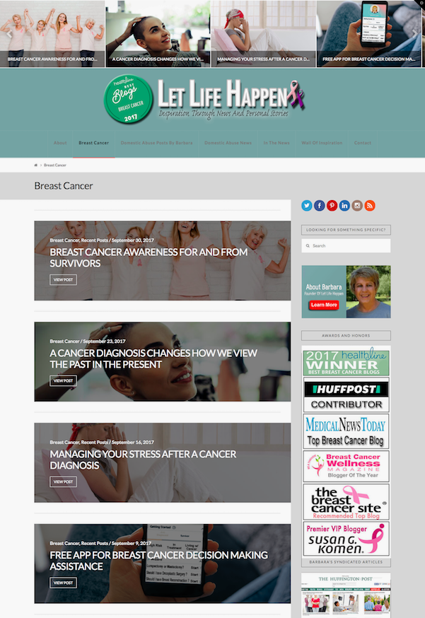 What We Love | Voted one of the best breast cancer blogs six years in a row, Let Life Happen is authored by two-time cancer survivor Barbara Jacoby. She also blogs about domestic abuse – something she has experienced – and is passionate about patient advocacy. Her website is one of the most informative online spaces for women battling breast cancer and includes up-to-date news articles and scientific findings. This blog is one of the best online resources for patients and survivors of breast cancer, as well as their family and friends.