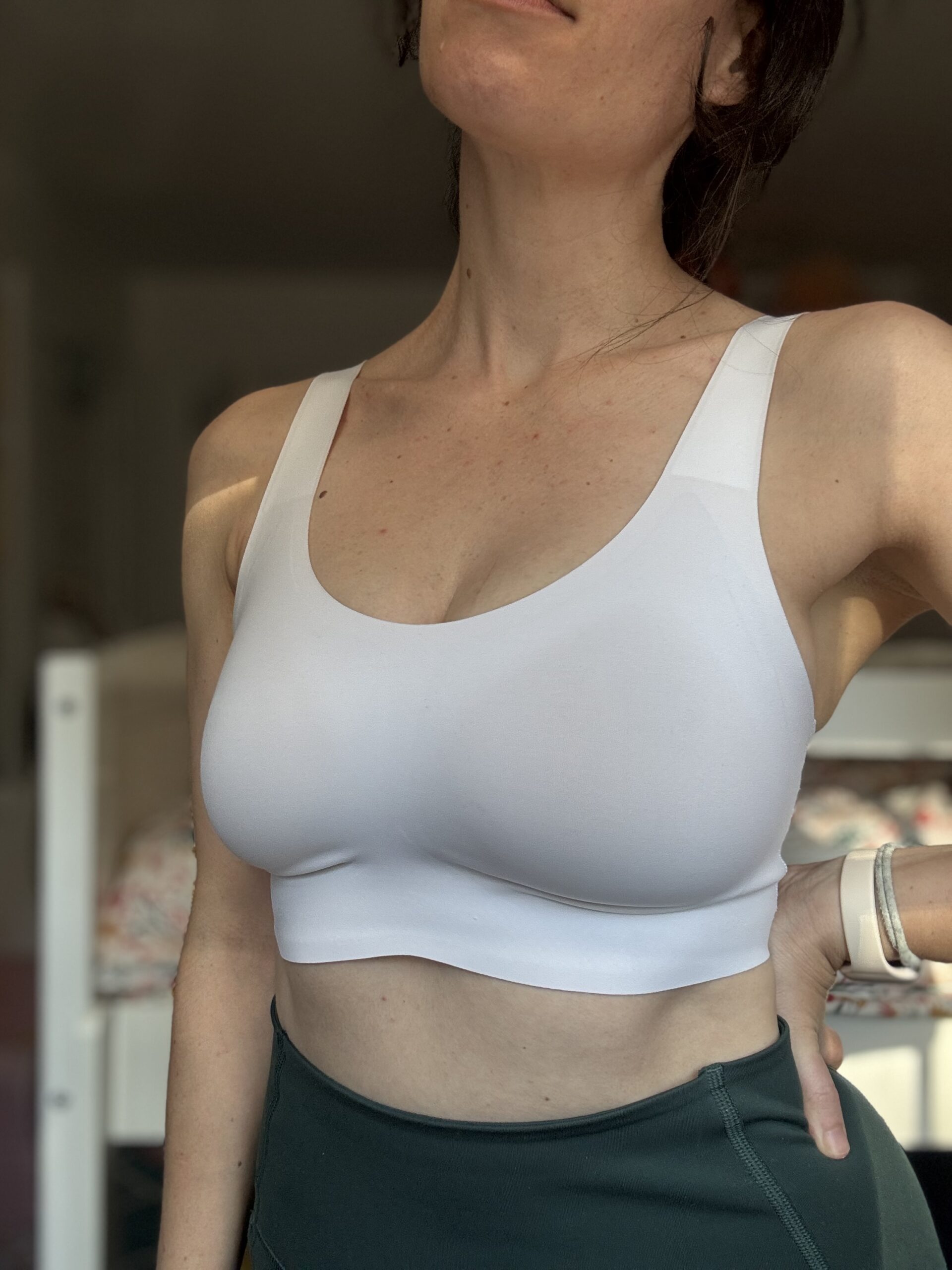 These bras are snug, no doubt about it. At first, I was a little worried I’d sized too tight and my boobs would be spilling out of the sides with one ill-timed forward bend, but within a few hours, they’d stretched just enough to fit exactly right. That’s because they’re designed with fabric that molds to your unique shape with wear — so don’t be alarmed if they feel a little tight-fitting at first.