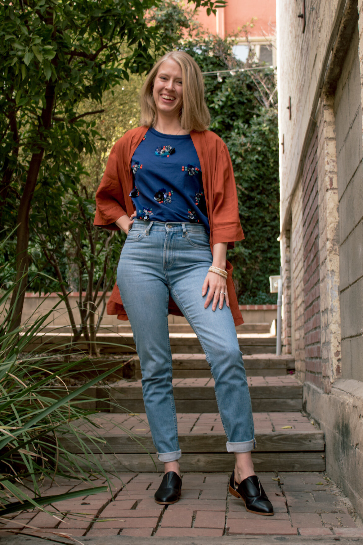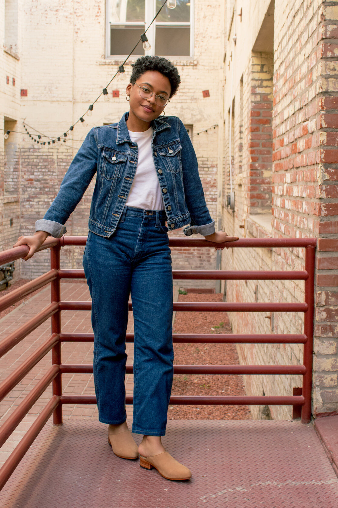 I think, as a rule, mules look best with a wider legged pant of some sort. I’ve recently been obsessed with these dark wash vintage Wrangler jeans I thrifted. I think they go perfectly with the mules, color and style-wise. My plain white tee from Everlane and vintage denim jacket top it off perfectly.