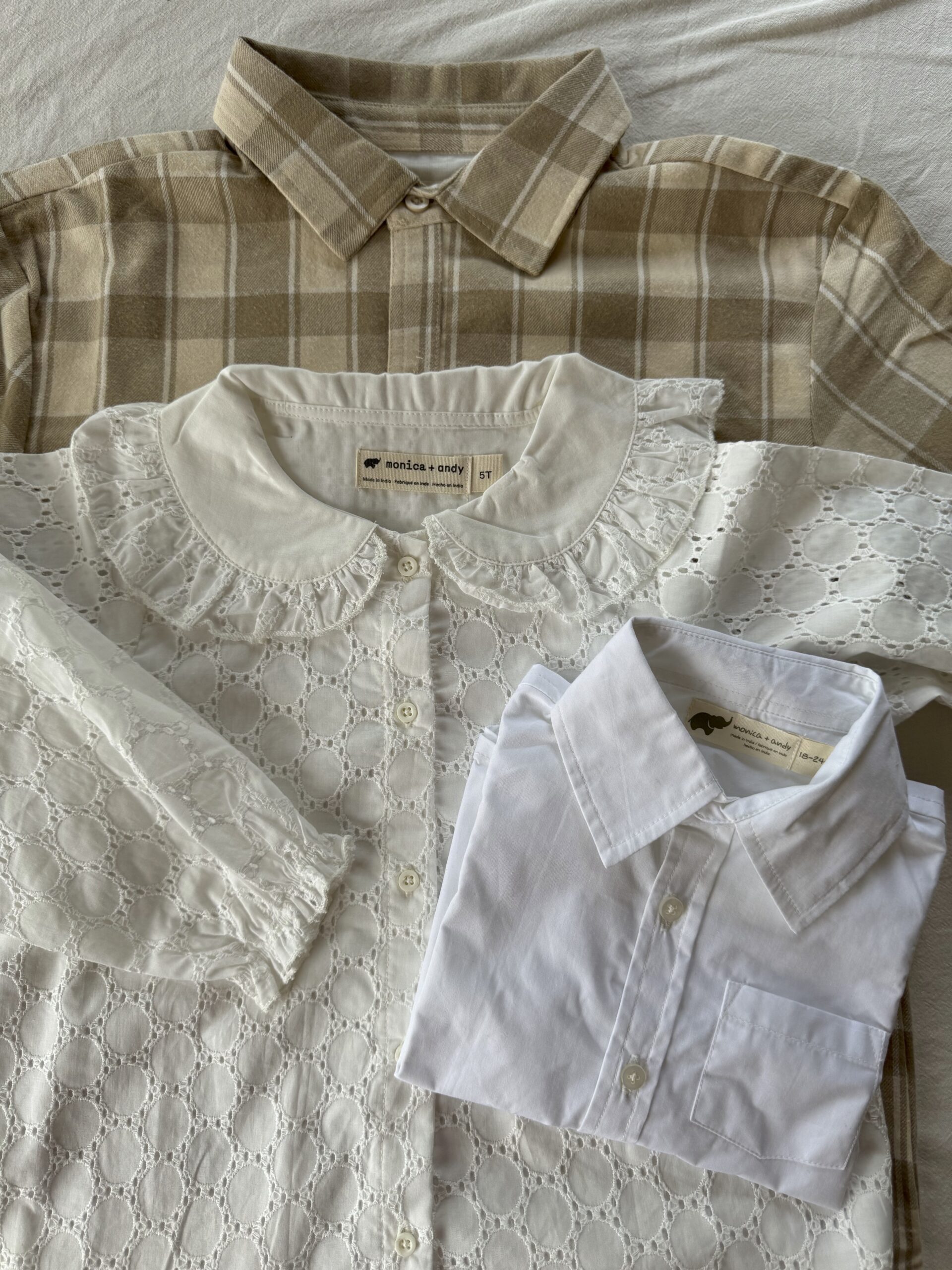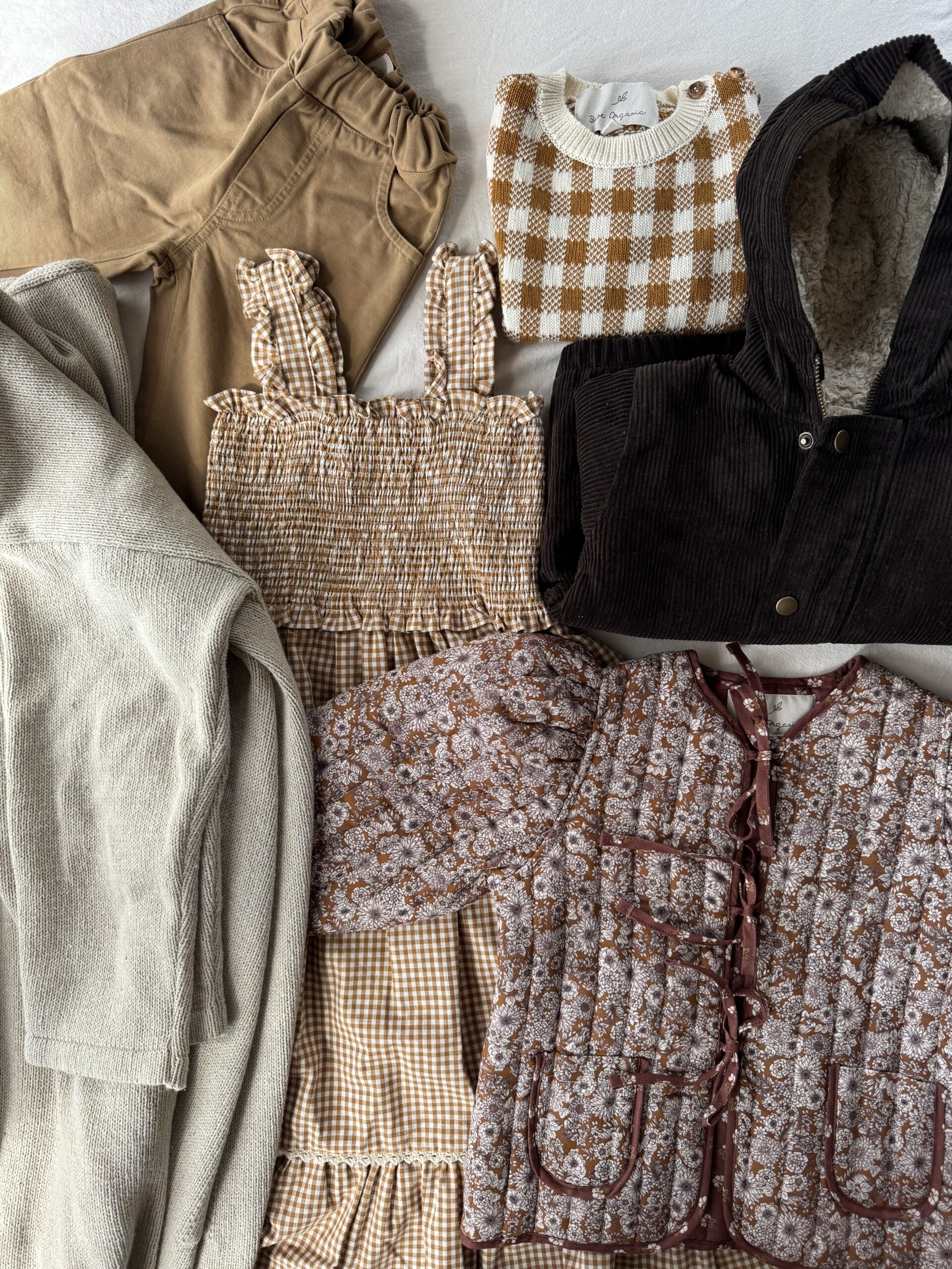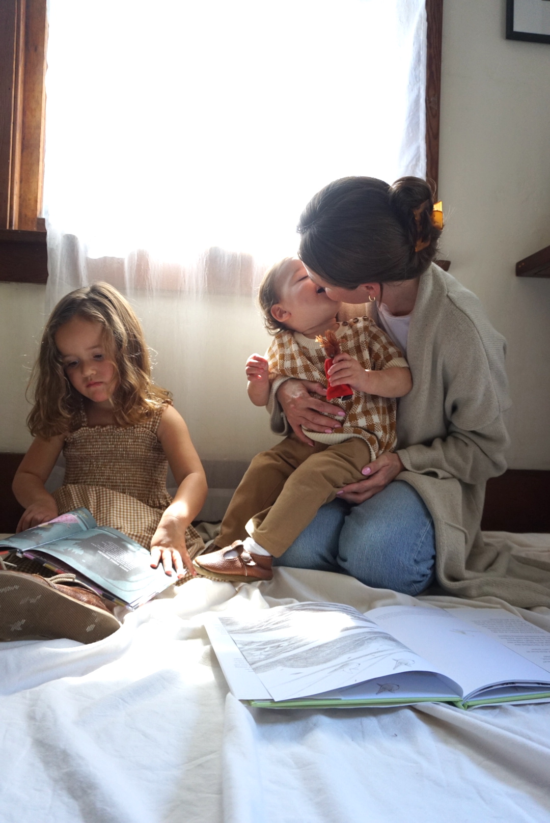 Manymoons is America’s first circular fashion retailer, sourcing ethically produced garments made from natural and regenerative materials. Every piece has been rescued from landfill (sometimes multiple times, thanks to their rescued collections, clothing rental, and give-back programs!) — and the brand commercially composts post-consumer clothing to return it to the earth at the end of its life. From organic baby bonnets to boutique dresses, the site offers most anything you might be looking for, with an ever-changing inventory that makes each piece feel so special and unique. When my Manymoons box arrived, each item was beautifully yet minimally packaged in simple brown paper. The quality of each piece is gorgeous, and my daughter wanted to put her full-length gingham dress on right away. I immediately knew these pieces would become family heirlooms. They also carry Women’s pieces from brands like Beamont Organic and Outerknown, so go ahead and browse those while you’re at it, mama! For example, I’m wearing the Beaumont Organic Shirley Recycled Cotton and Wool Cardigan in stone here.