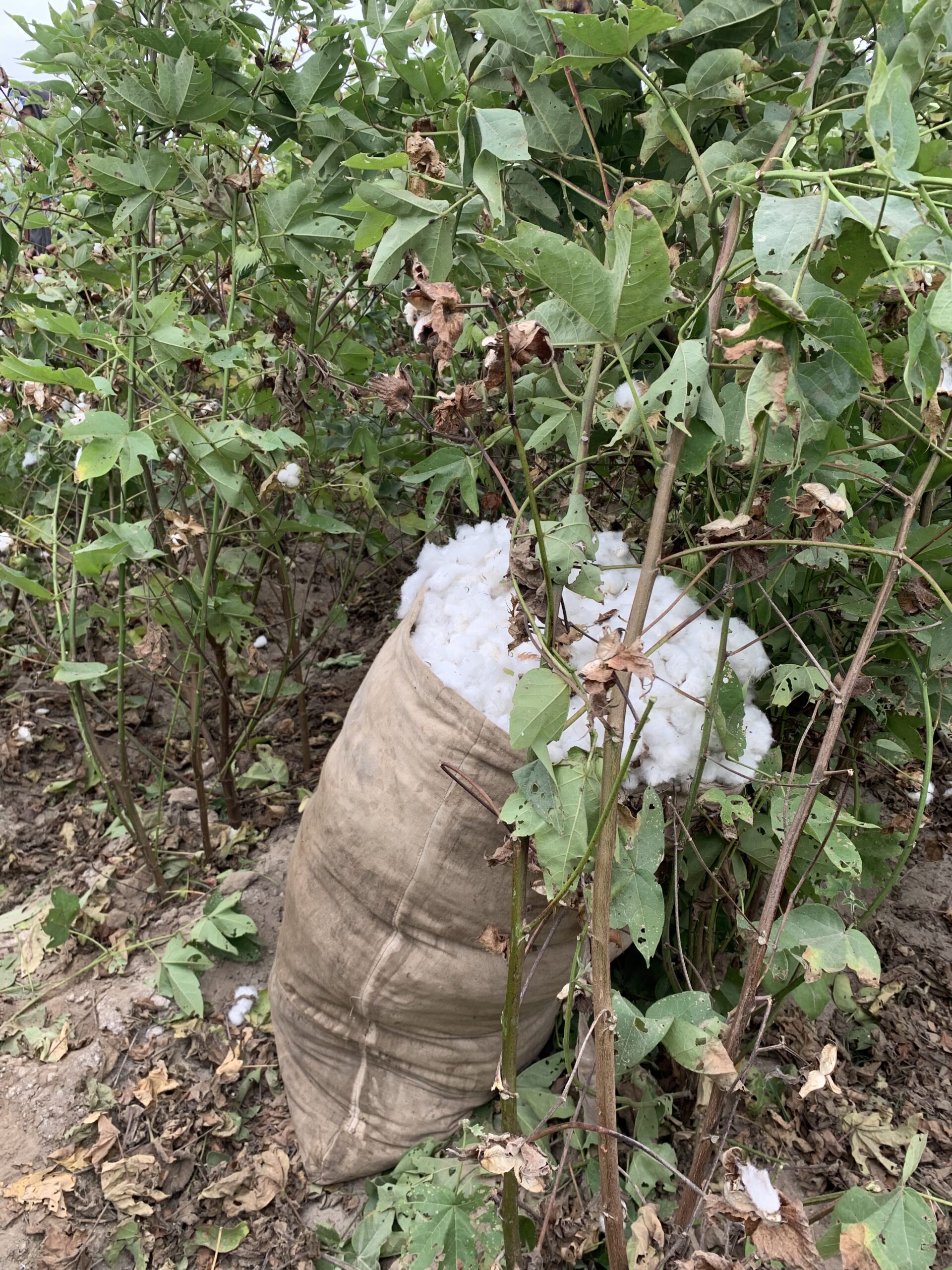 Surprisingly, it was difficult to see much of a difference between the ROC fields, the organic fields, and the nearby conventional farms unless you knew what to look for. But once we got up and close to the cotton, we noticed small things, like cut-up water bottles tied to wooden posts dispersed throughout the fields. These were filled with a sugar-like liquid to attract bugs and deter them from the cotton plants—an alternative to pesticides. With regenerative organic farming, some main differences are little to no tilling, using cover crops to keep the soil fertile, and intercropping.