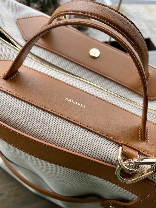 When my cream and camel-colored set of the Aviator Plus carry-on and Weekender arrived, I rolled them gleefully around my apartment and daydreamed about gliding through airport terminals. The Aviator Plus is a sturdy-feeling hard carry-on designed to fit 4 – 7 days of clothing and 2 – 4 pairs of shoes (dimensions are 14.7″ x 22.7″ x 9.6″, or 37.3cm x 56.7cm x 24.4cm, meeting TSA requirements but always worth double checking with your airline). All of Paravel’s hard cases come equipped with a TSA-compliant code lock and feature a compression board (in a zippered pouch), a separate shoe storage compartment that zips shut, and one more small interior zipper pocket. There’s even a separate laundry bag included!