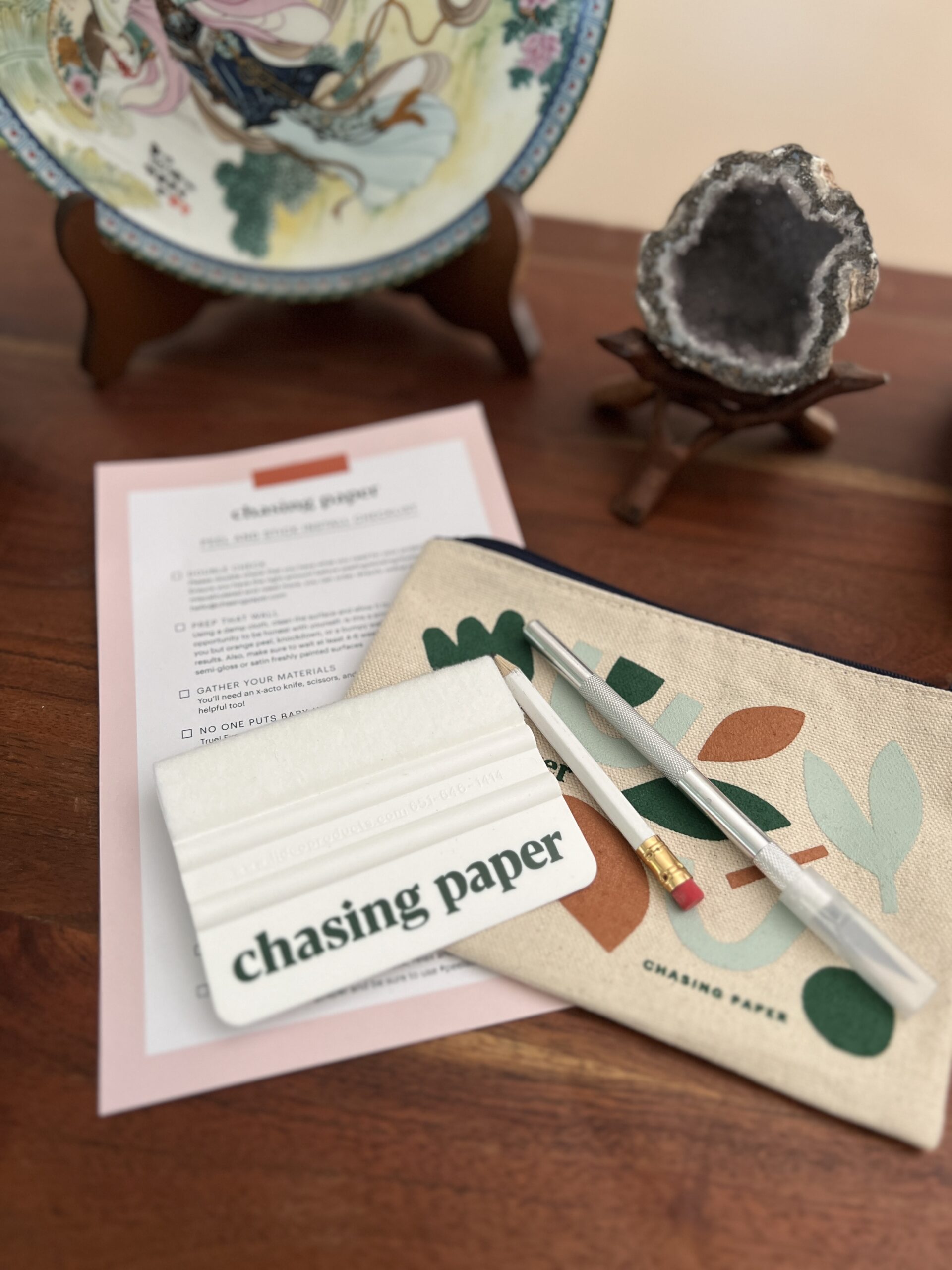 My order came with a “Peel and Stick Install Checklist” with seven systematic steps, beginning with cleaning my wall, baseboards, and trim with a damp washcloth. I didn’t need to gather my tools since Chasing Paper sent me an adorable zippered pouch containing a pencil, an X-Acto knife, and a wallpaper smoothing tool. The brand recommends using a tape measure but I opted to install freehand so I could attest to how difficult (or easy) the job turned out to be.