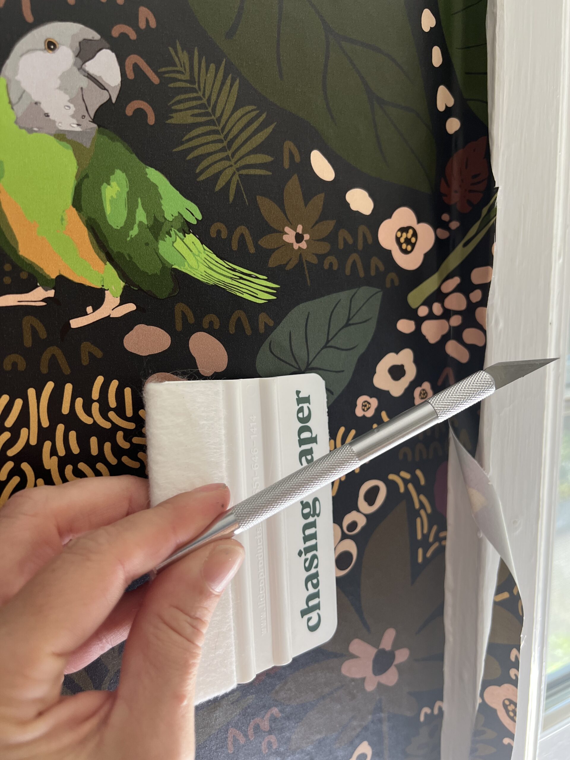 If there was a bubble, or my lines got wonky, I was able to peel back the panel and push out the bubble, or readjust the line up without losing any stickiness. Feeling brave, I didn’t even remove my outlet cover pre-installation; instead, I used my X-Acto knife to make tiny cuts along the bumpy edgy of the outlet cover and honestly, it worked out great. For the windows, I trimmed off lots of excess paper, and then used the straightedge side of the smoothing tool to press the paper right along the trim in two-inch increments before I cut, and stuck it down.