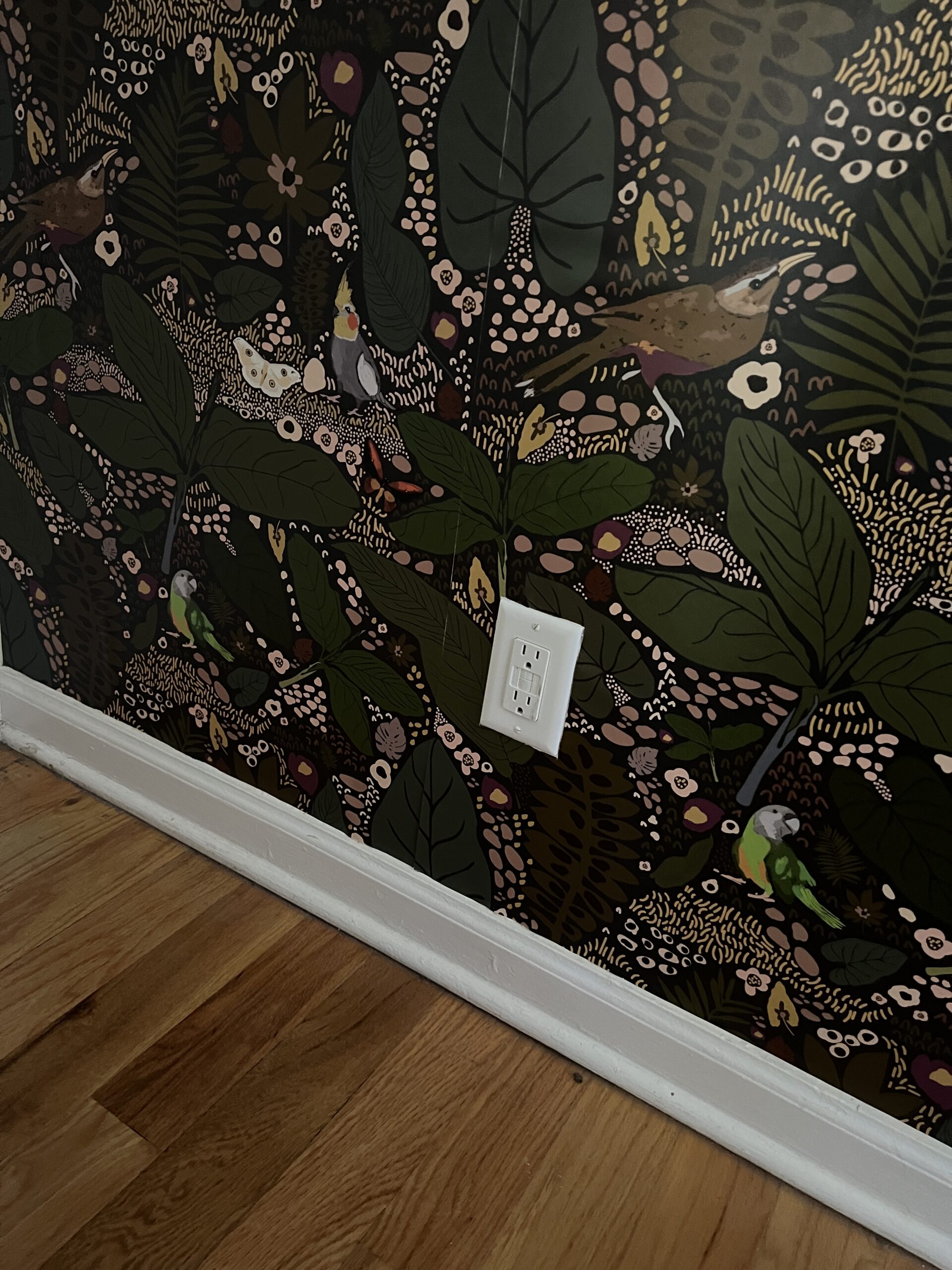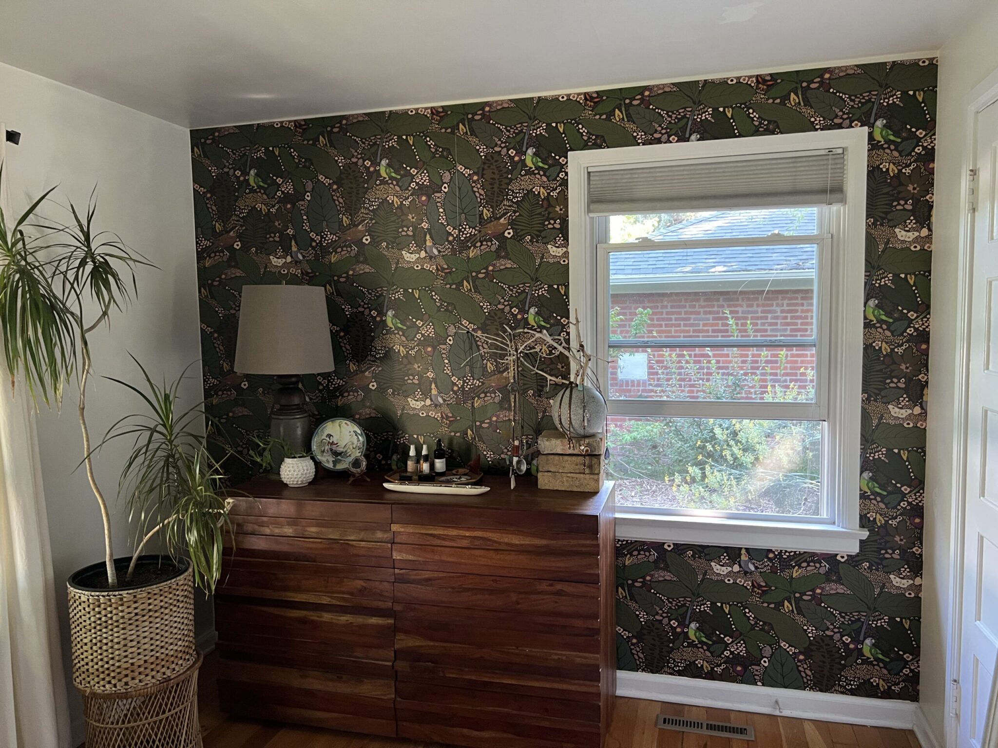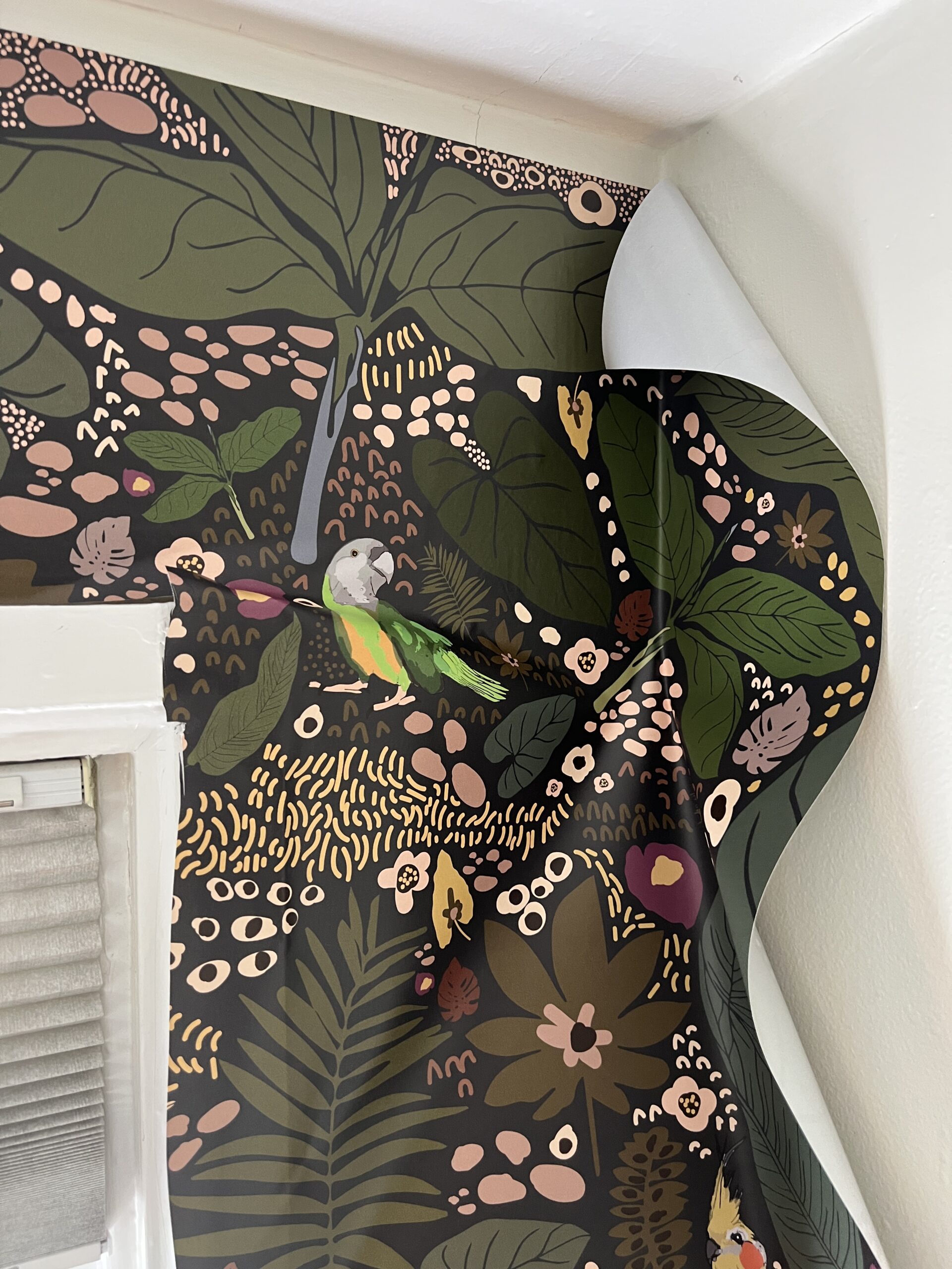 All in all, the project took up one afternoon while I listened to birds sing outside my windows and put Birds of Paradise on my wall. I had a slight bit of trouble perfectly lining up the seams and ended up deciding I didn’t mind seeing a teensy strip of white between panels. If this would drive you bats, I recommend choosing a lighter wallpaper so the seam lines don’t show up as much as on a dark background. Cutting around the window was the most difficult part of the whole thing; it would have helped if I’d caved and used a tape measure around the window trim.