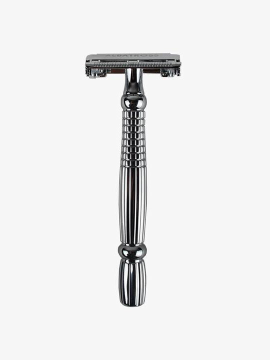 Albatross Shaves’ double edge razor, The Butterfly, comes in two stainless steel options: the classic handle at 3.5” in length and the long handle at 4.75”. And once you’re done with the stainless steel blades? Albatross has a take-back program to help you recycle and repurpose them once again.