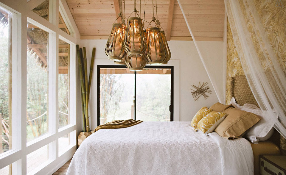 Location | Fern Forest, HI Eco-Friendly Features | Solar power, rainwater catchment, natural lighting, cork shower, bamboo construction Features | Treehouse, DIY light fixtures, DIY rock sink, local coffee, organic shampoo/conditioner, indoor/outdoor shower, wrap-around porch Nightly Rate | $200+