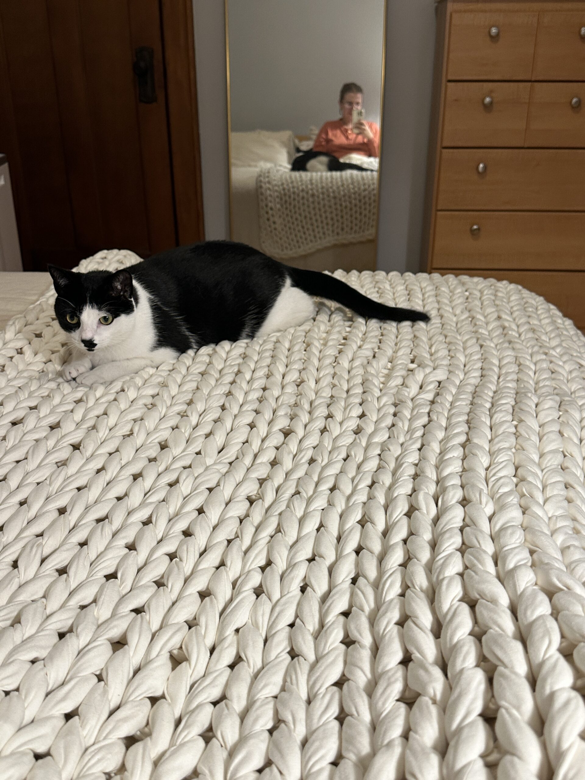 Baloo’s machine-washable weighted blankets are made from soft organic cotton and lab-tested lead-free glass microbeads. The blankets come in three sizes, four weight options, and four to five color options (depending on the size), all shipping in compostable, plastic-free packaging. The company is carbon-neutral and ocean-positive — they partner with Sea Trees to plant trees and restore habitats to support endangered species. Baloo also partners with the nonprofit Pajama Program, which promotes equitable access to healthy sleep for children; each purchase goes toward supporting this mission, through providing bedtime materials like books and pajamas and sleep health education. Sleeping with Baloo’s weighted blanket is a dream; it was easily my favorite of the blankets I tested. I tried the 12 lb throw, and it’s soft, provides a great distribution of the weight, and fits to your body. It is also really breathable for a non-knit blanket, making it a great option for warm sleepers or the warmer months. It also folds up the smallest out of all the blankets, making it a good option for those living in smaller spaces. Looking for something a little more permanent for your bed? They also have weighted comforters.