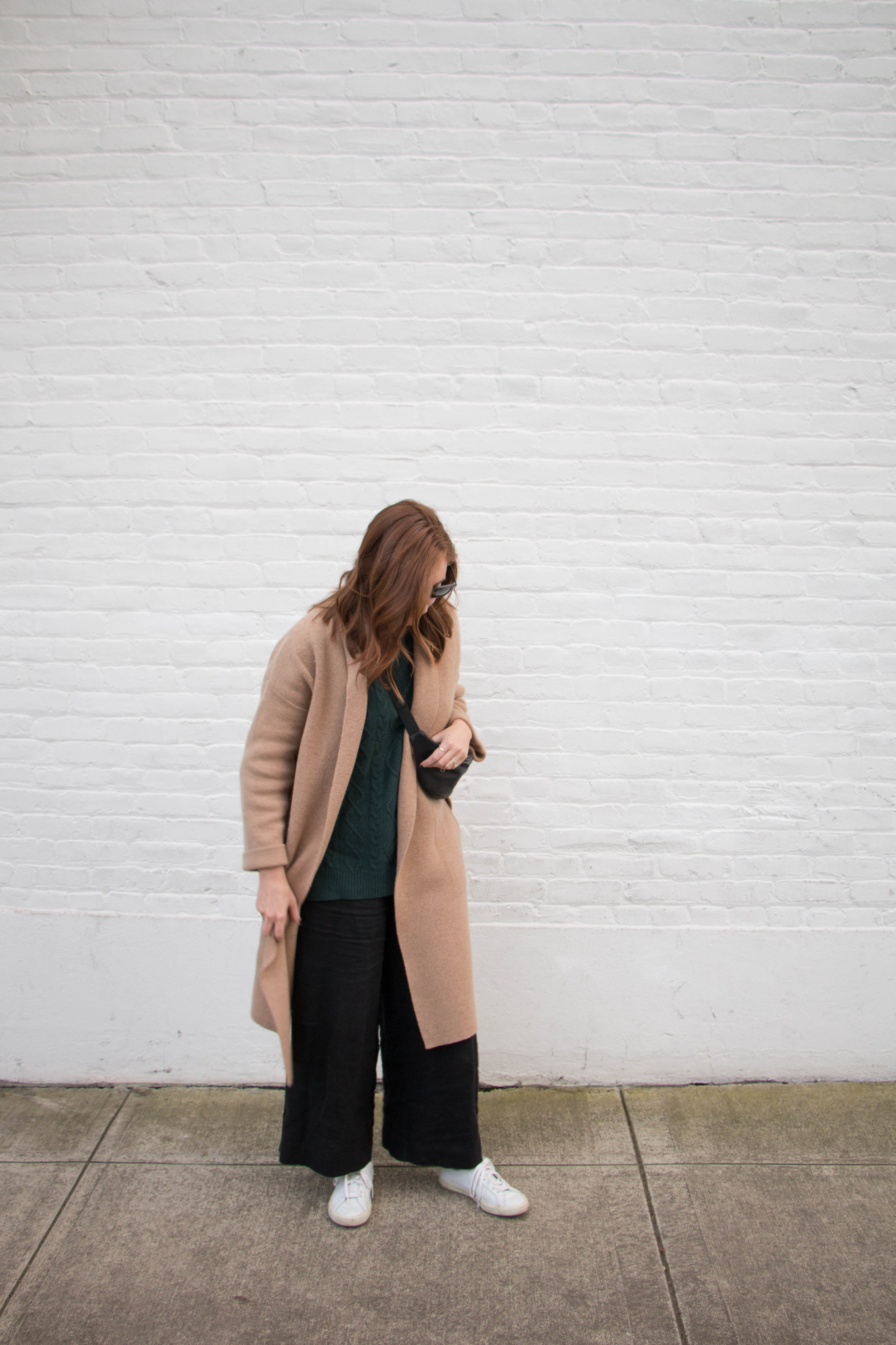 I actually wore this outfit to go see The Last Jedi in theaters and it has been on repeat ever since! My linen Florence pants are one of my favorite pieces in my wardrobe and I’m so happy that I can just add some tights or leggings underneath and stay nice and toasty in the winter. Also fun fact, this green sweater is the only actually color item in my winter capsule right now!
