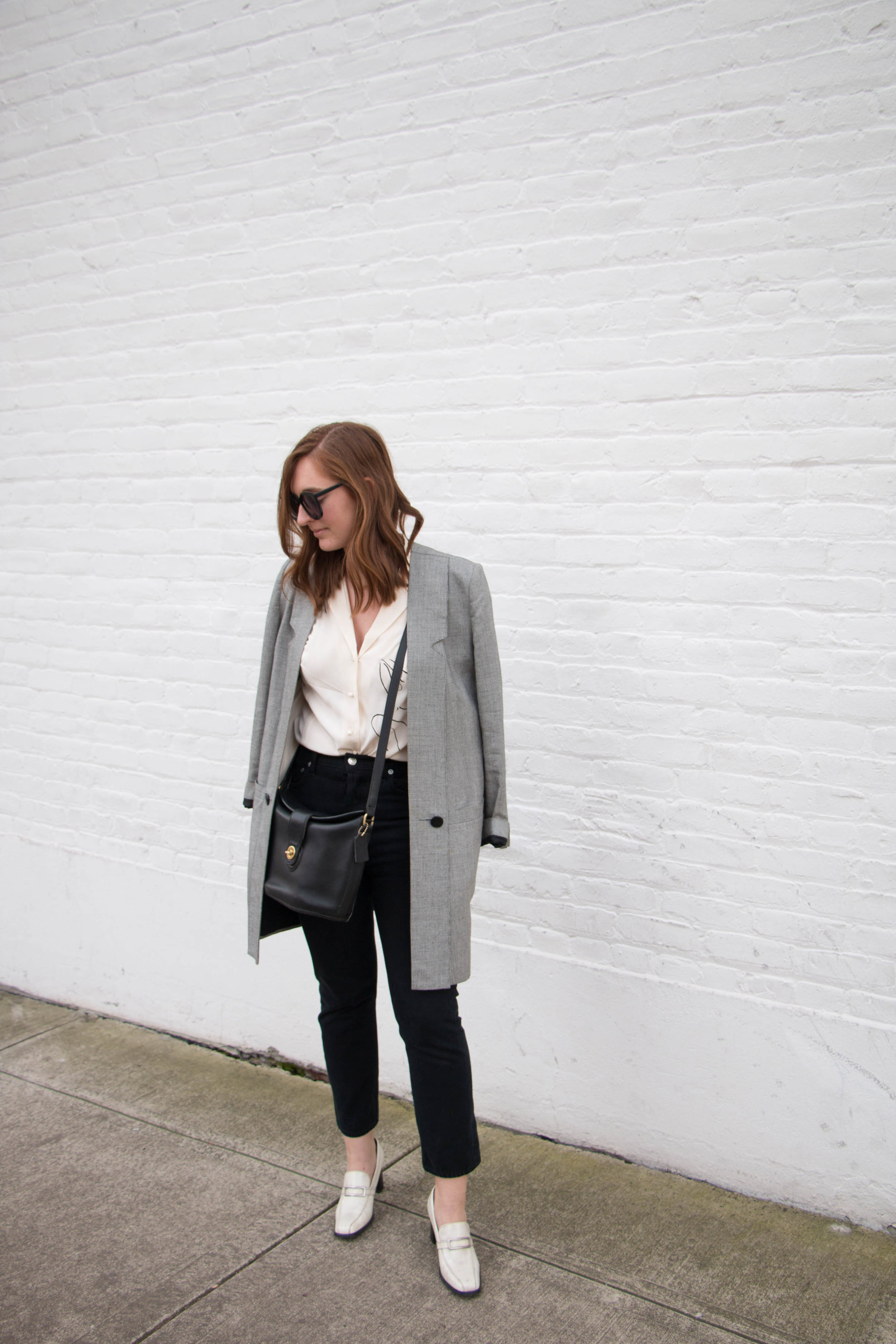 Lately I’ve been playing around with mixing masculine and feminine pieces and I think this look is a great blend of both. The blouse is a soft and gentle piece in comparison to the oversized but still structured blazer. I also love the color components of cream, white, houndstooth and black. It’s put together but doesn’t feel stuffy or stiff.