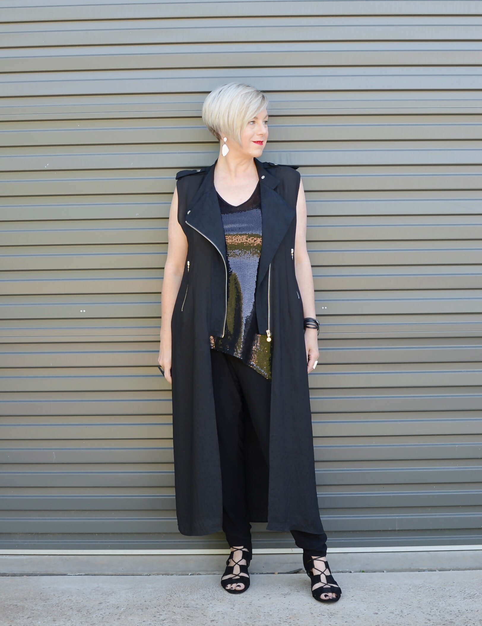 Taking daytime wear into evening by adding some sparkle! The long vest and slouch pants are items I frequently wear to work but adding the fun sequinned top and I’m ready for a rare Saturday night out. Motto is a brand I have been wearing for about 5 years and one of the first brands I discovered making locally. Motto recently moved some of their production off shore but frequently visit their factories ensuring safe labor practices.
