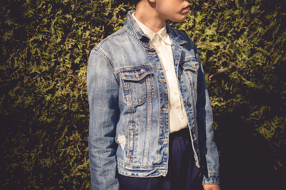 Thrifted denim jacket | Thrifted silk blouse | Thrifted wool trousers