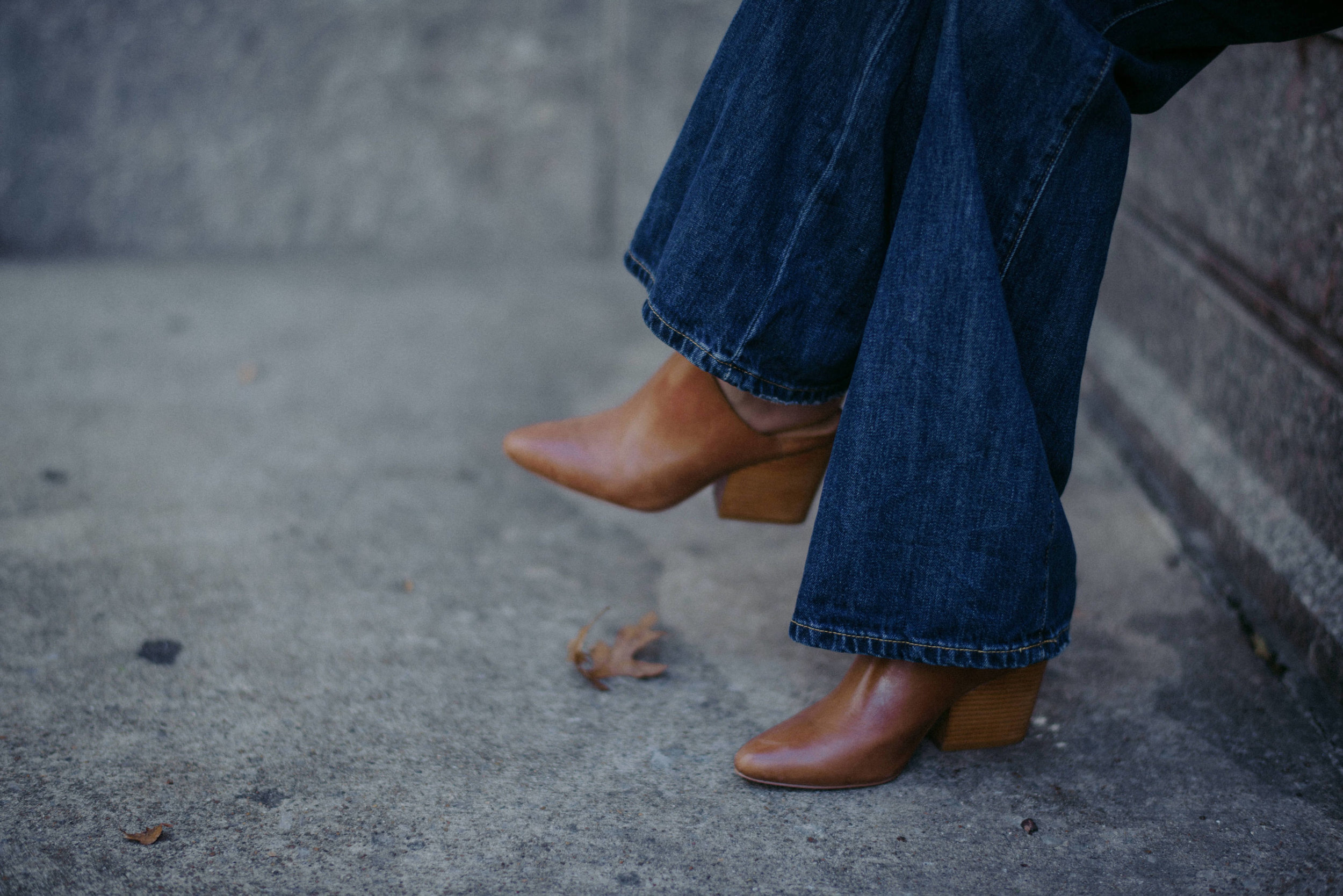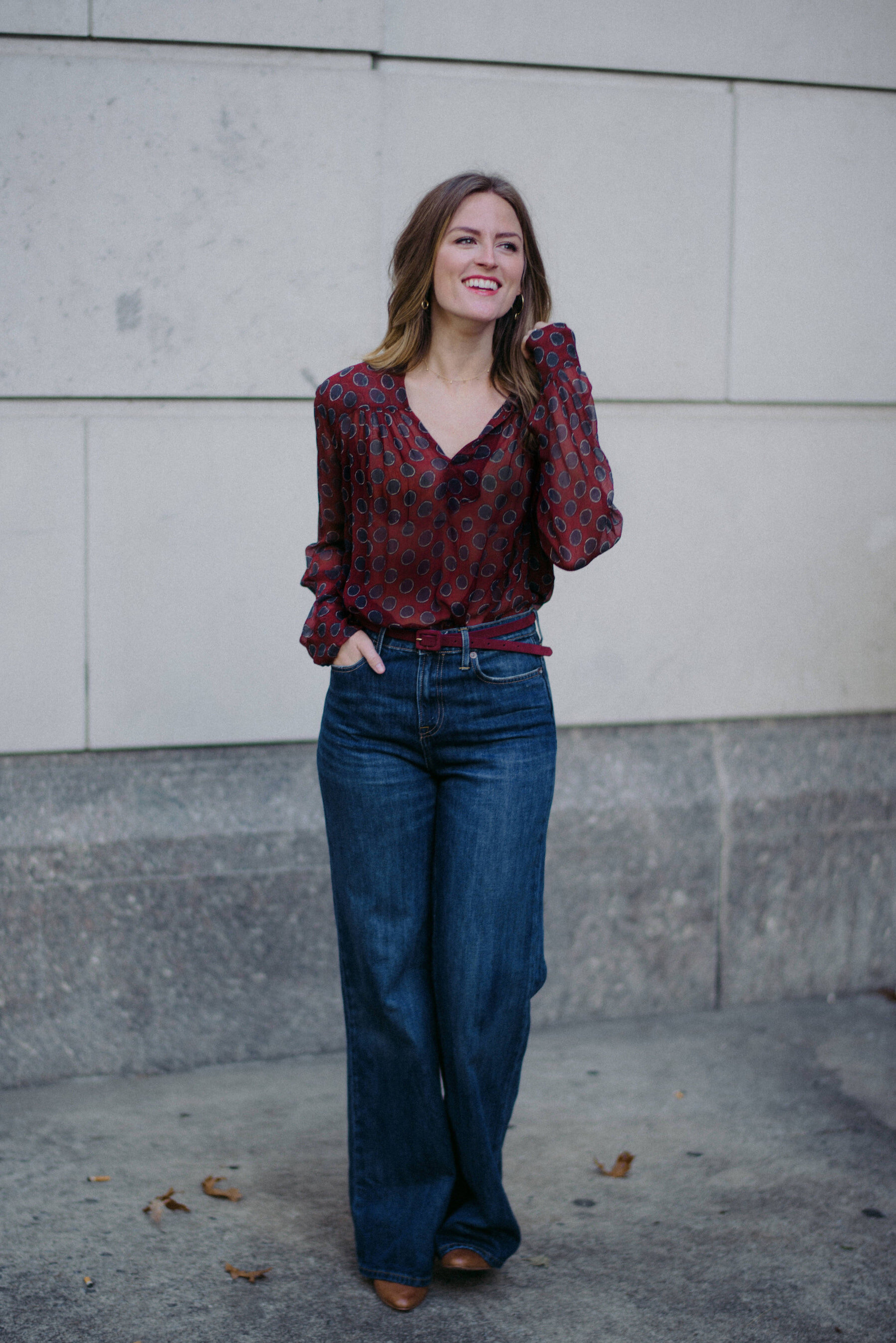 One of the best ways I score high-quality clothing and designer items is thrifting! I usually thrift when I’m traveling and find keepsakes that help me remember my trips, but I actually found this shirt at a local shop in Nashville. The flowy shirt, wide leg pants, and cognac accents give me 70s boho vibes—perfect for an afternoon presentation at the office. It’s a casual, comfortable look that still feels elevated because of the materials and the tall, wide leg denim.