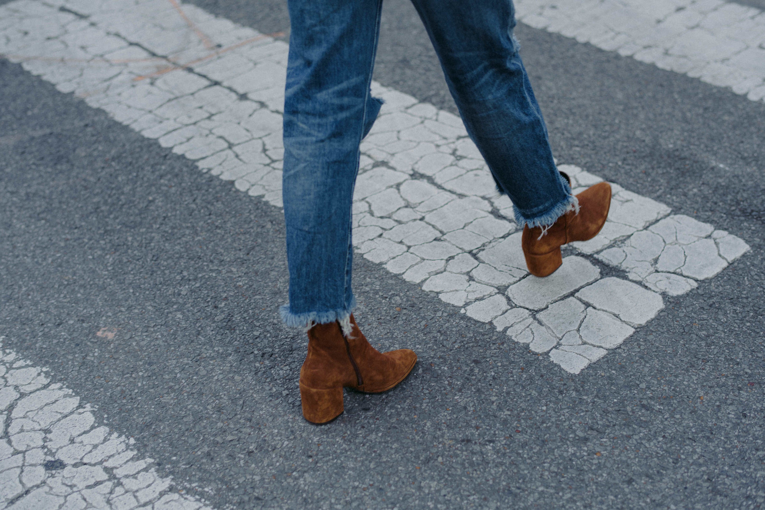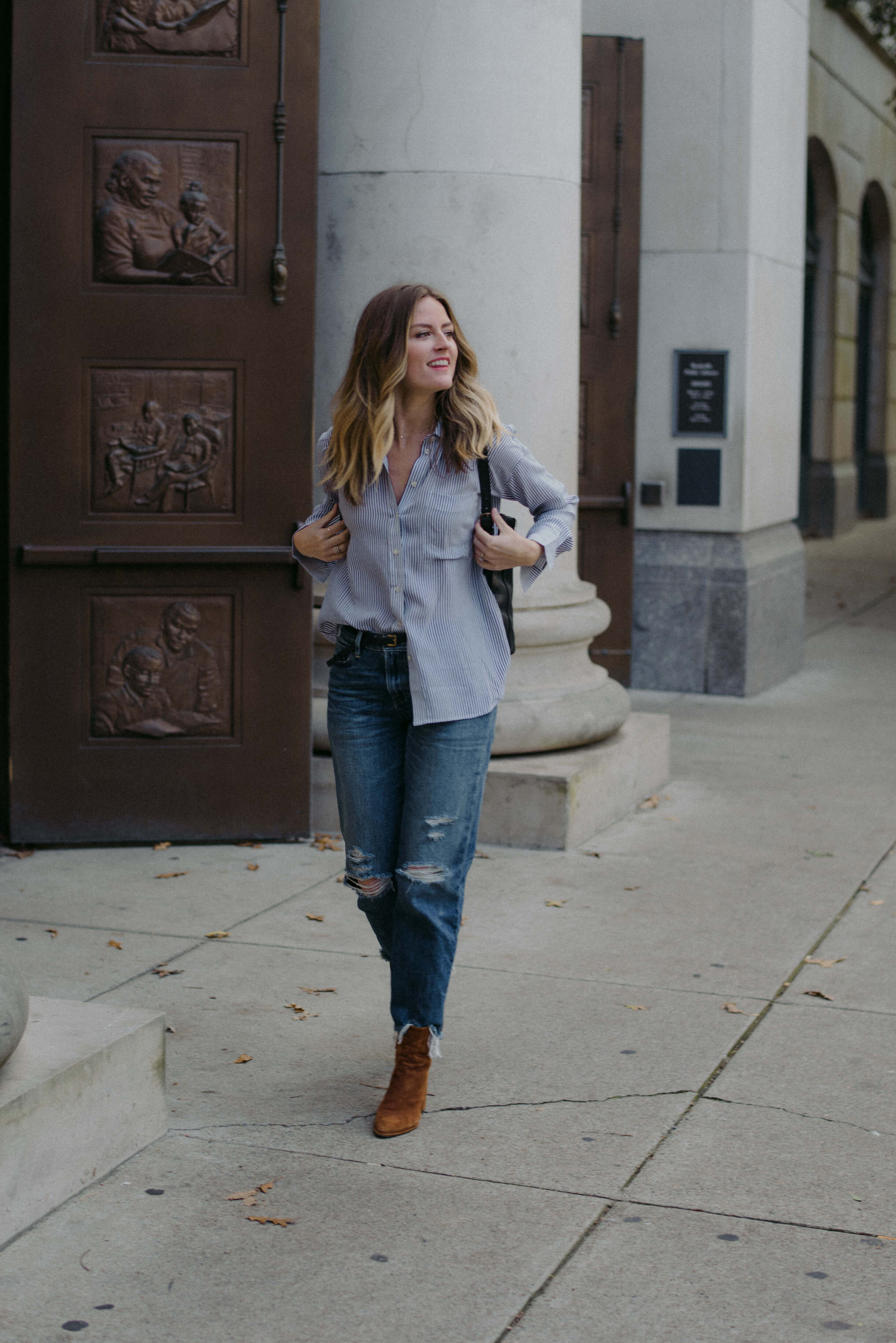I have this thing for silk shirts—specifically, silk button downs. They’re so timeless, and they make me feel instantly put together whether I’m wearing them with jeans or trouser pants. This is my to-go outfit for ABLE studio shoots because it’s so practical and easy. The black and white stripes plus the chestnut boots? Come on!