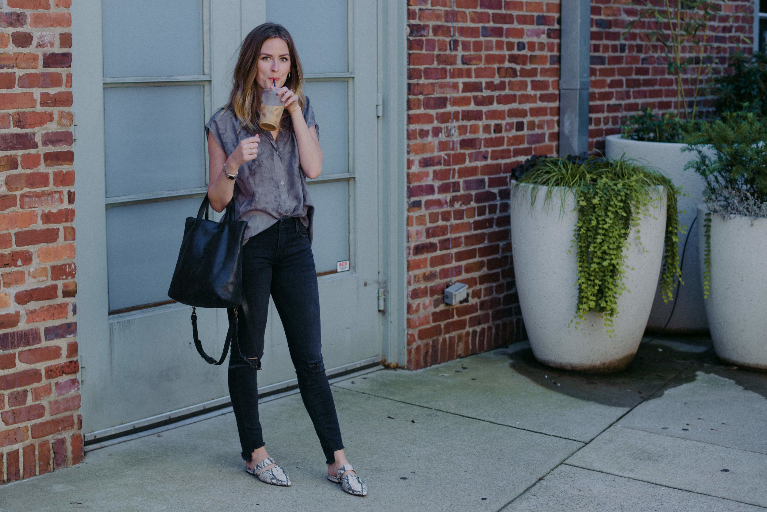 Relaxed and effortless. When I have a day full of desk work and errands, this is what you’ll find me living in. I thrifted this silk top on vacation in LA (I think it was $15), and it’s been one of my favorite, most-used purchases. And don’t even get me started on that Abera Convertible Backpack. It keeps me hands free, so I can grab coffee and run my errands as efficiently as possible.