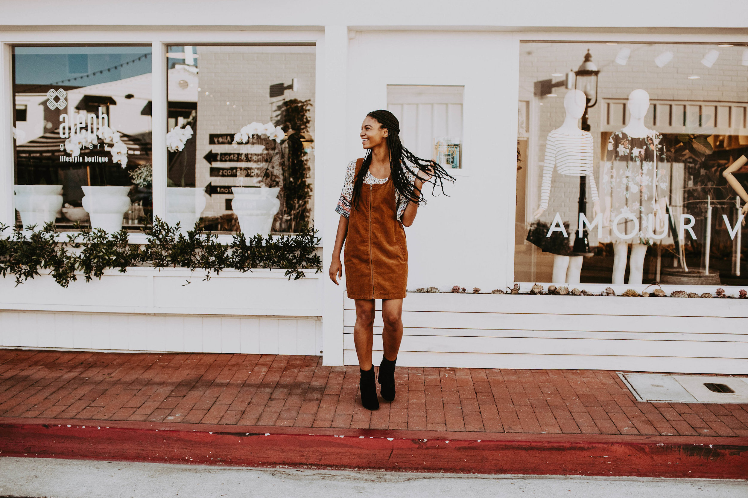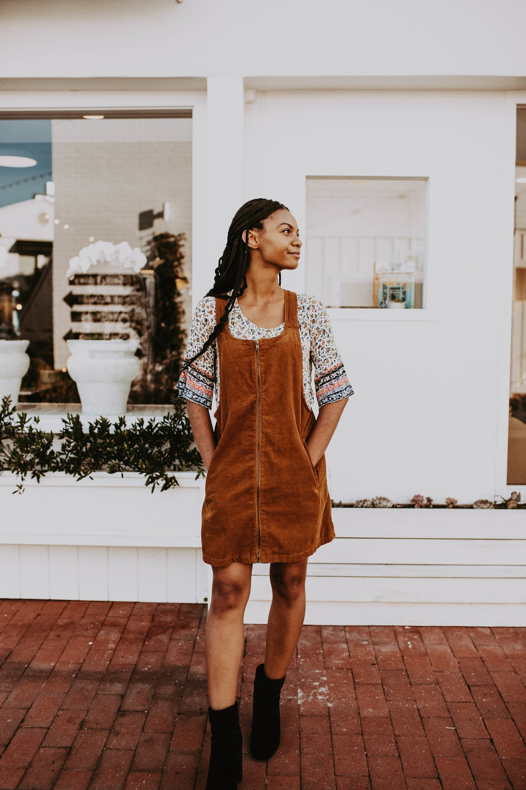 I got this overall dress from Goodwill as well as the top. I’ve really loved 70s-inspired outfits and the color of the corduroy was really reminiscent of that. It makes me feel fun, but I dress it up so I don’t look too young with a pair of black velvet booties that I also thrifted! My office is pretty casual so I can experiment with outfits a bit more which is fun!