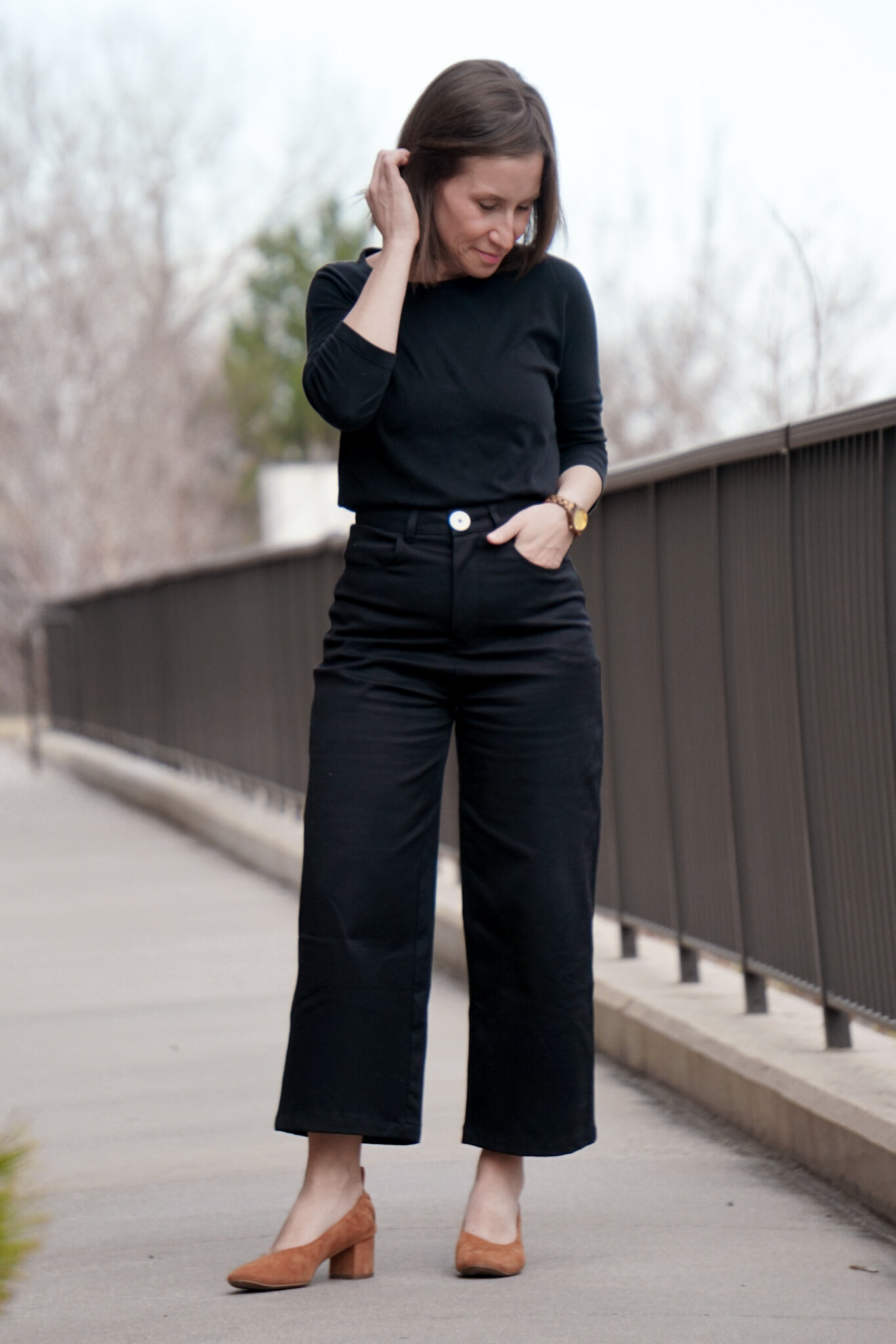 I kept my accessories simple to let the all black outfit and wide leg pants take center stage. And I’m forever wearing my brown shoes to warm up the outfit and create another element of interest.