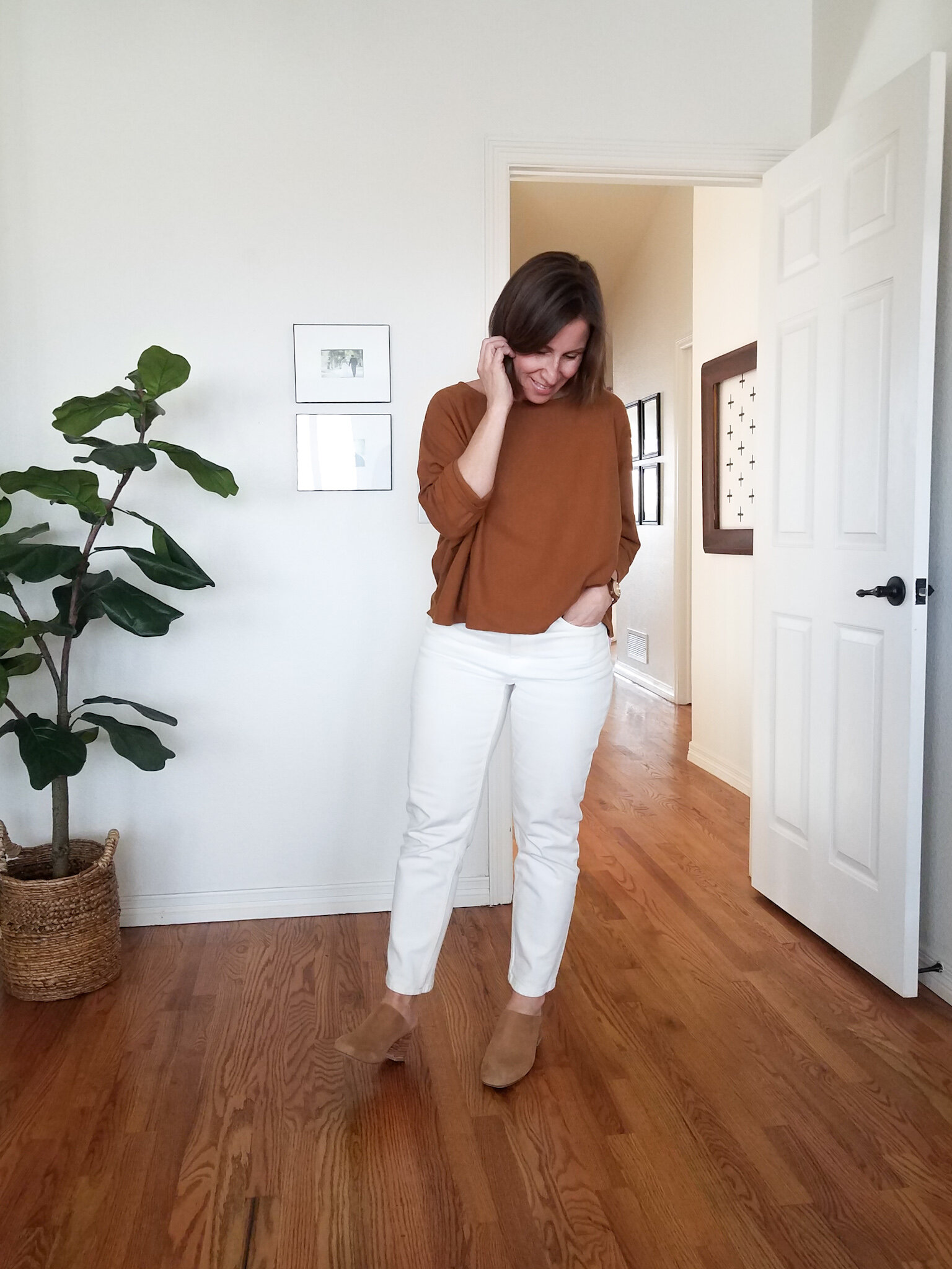 Here I am in the places I spend the most time—my kitchen and my classroom. First coffee, then all the math. Casual Fridays undoubtedly mean jeans and clogs, of course with a comfy sweatshirt or tee. I was thrilled to find this sweatshirt secondhand after seeing it on another Instagram account. This rust color gets me every time and I think it’s just as important to have comfies I love to wear.