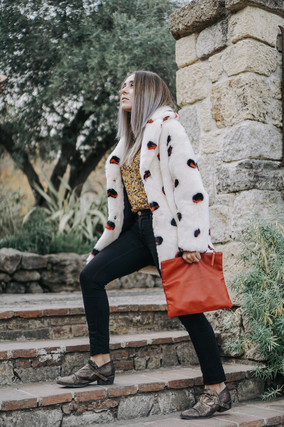 Gifted Westmoon LA top Thrifted coat Pre-loved jeans Secondhand clutch Matisse Footwear booties
