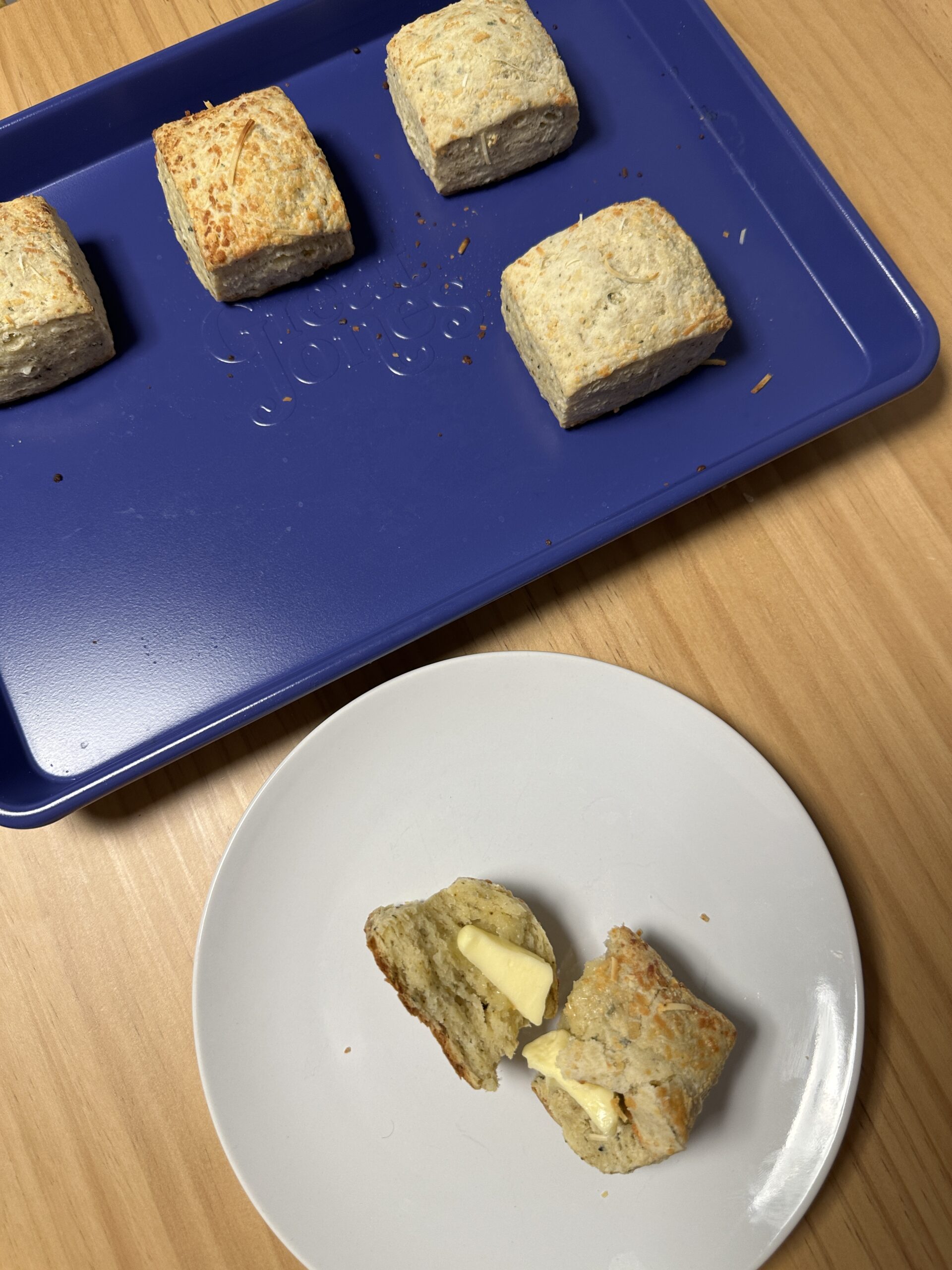 The next day, I was itching to try the parmesan herb biscuits. I was going to save them to serve with dinner, but they ended up being a Sunday afternoon snack. I made all six on a sheet pan, baking them at 390 degrees for about 28 minutes (the package said 25-30 minutes). I ate a biscuit with the churned French butter, and it was savory, salty, and the perfect biscuit texture, crumbly but not too crumbly, flaky on the outside, and so good when warm. I rewarmed one the next day for breakfast, and it was just as good as leftovers. I want to order these again to try them with a roasted chicken or a hearty stew.